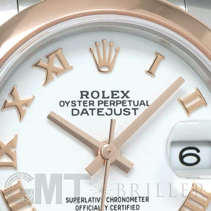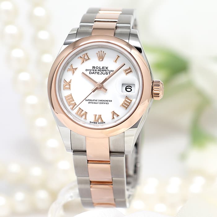 1945年に初登場してから、流行に左右されない不変的なデザインによりロレックスを代表するモデルとなったデイトジャスト。28mm径のレディ デイトジャストは女性の美しさを最大限に引き出す流れるようなラインのエレガントなデザイン。ロレックスが特許を取得したシリコン製シロキシ・ヘアスプリングを採用したムーブメント「Cal.2236」搭載。 ケーシング後にムーブメントのクロノメーター精度および、防水性能、自動巻、パワーリザーブを独自に検査。ロレックスが新たな基準を打ち立てます。 ロレックス独自のRG「エバーローズゴールド」と904Lスチールのコンビ”ロレゾール”に ホワイトローマンダイヤルはシンプル且つエレガントなモデルです。
