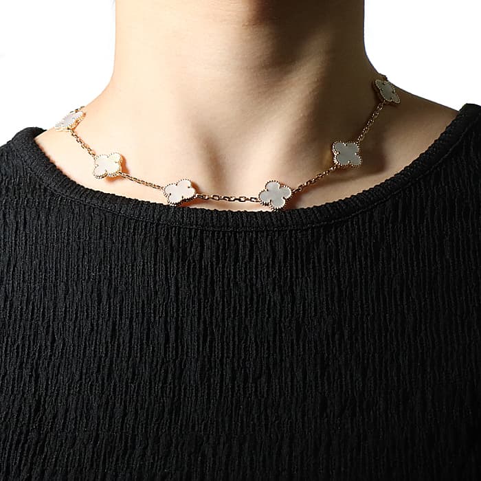 ヴァン クリーフ&アーペルの中でも常に高い人気を誇る「アルハンブラ」コレクション。 「VCARF48500」は、幸運のシンボルである四つ葉のクローバーのモチーフが10個も連なり、一目でヴァンクリーフ&アーペルとわかるアイコニックなネックレスです。 イエローゴールドを贅沢に使用し、ホワイトシェルをあしらったモチーフは、光によって美しく表情を変化させ、上品な輝きを放ちます。