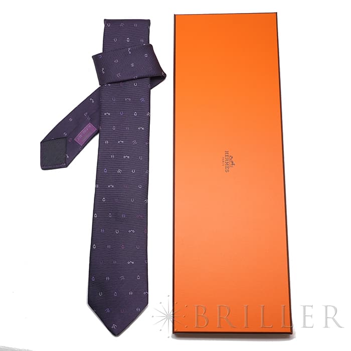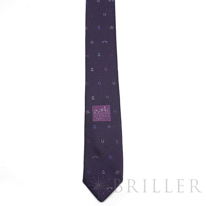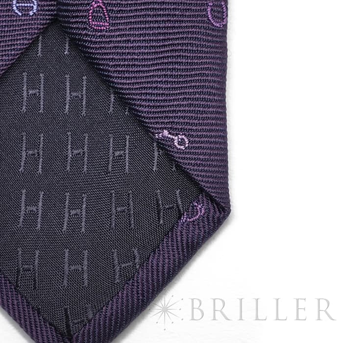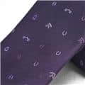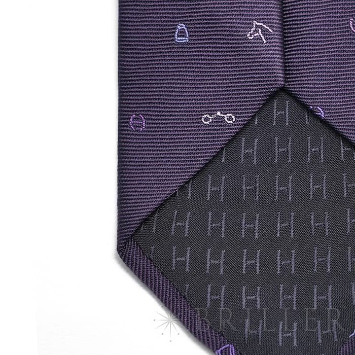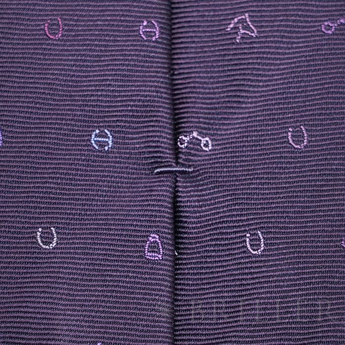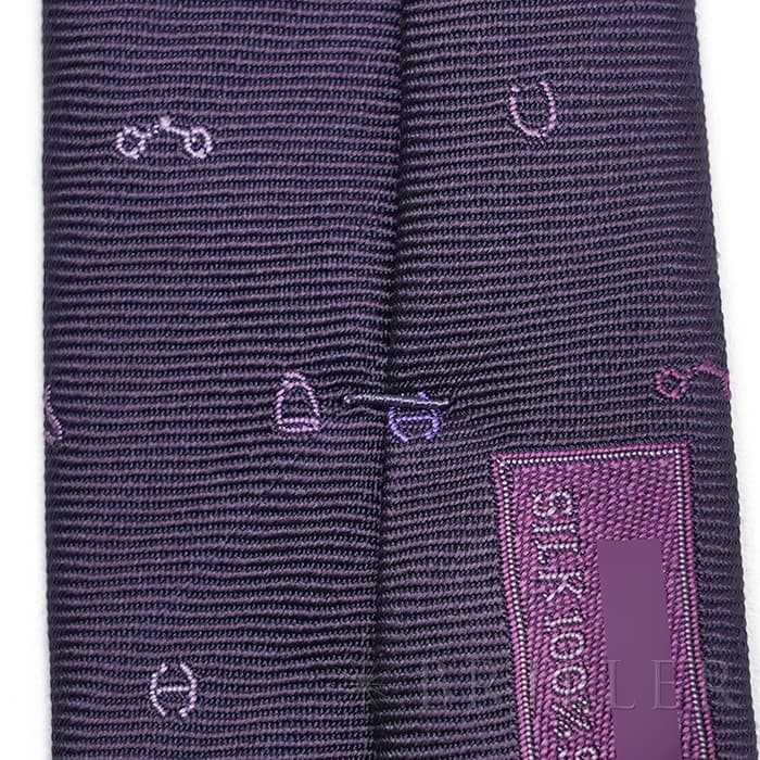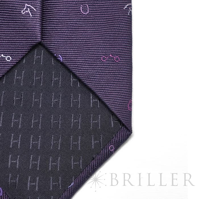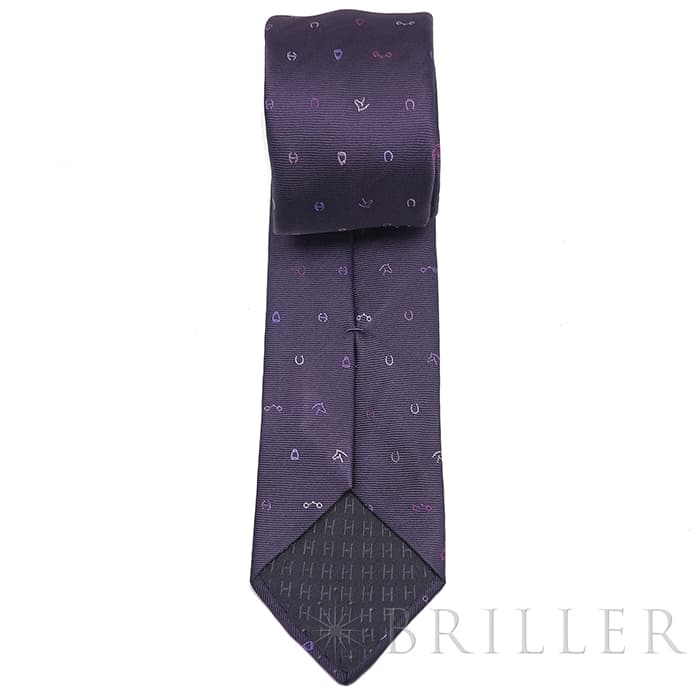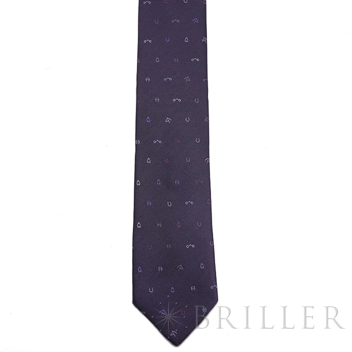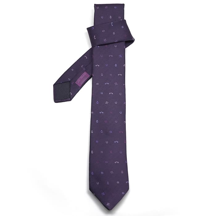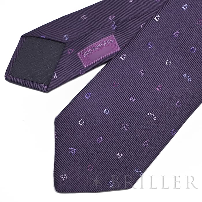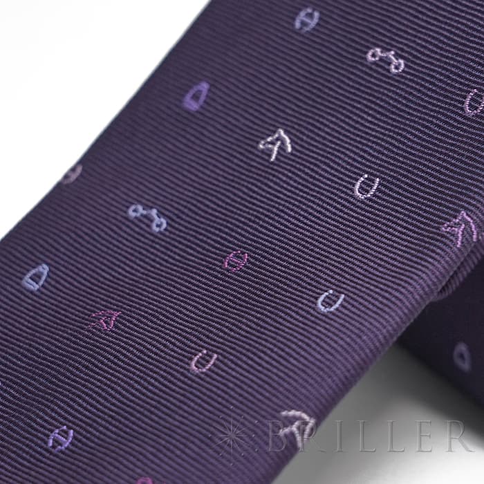 馬具一式が、刺しゅうでちりばめられたネクタイ。エレガントなパープルにシルク100%の質感がコーディネートにリュクスな雰囲気を醸し出しています。