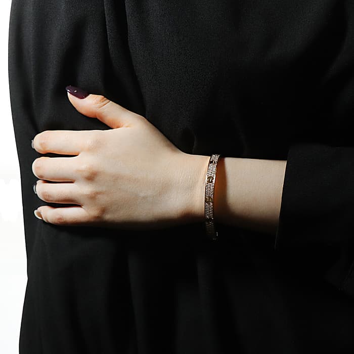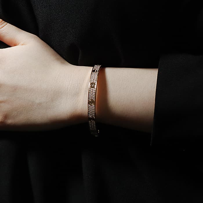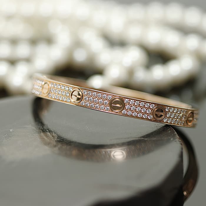 世界5大ジュエラーとして世界中から愛されるブランド「カルティエ」。カルティエが手掛ける「束縛」や「愛の絆」をテーマにして作られた「ラブコレクション」は、老若男女問わず不動の人気を博しています。こちらは人気の高いピンクゴールドのブレスレットの表面に、贅沢にダイヤを配置した華やかでゴージャスなブレスレットです。煌びやかなダイヤと洗練された印象を与えるピンクゴールドのリングがお手元を美しく飾ります。