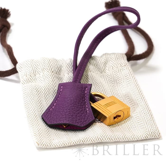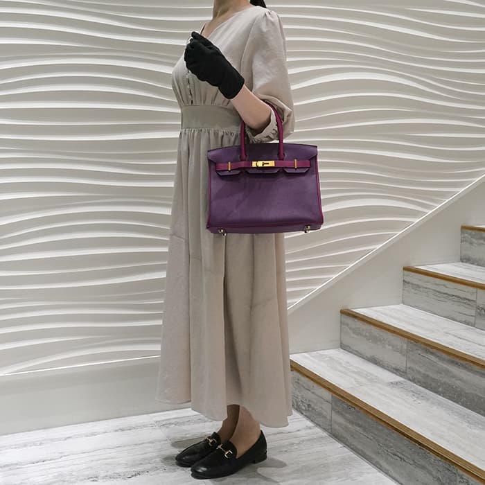 「バーキン」の由来は女優の「ジェーン・バーキン」が航空機でエルメスの社長と出会い、物があふれかえりそうになっている彼女のバッグを見て、収納がたくさんできるバッグとして創られました。整理せず物を入れることができる秀逸な「バーキン」は全世界で愛されています。ハンドルが長いので腕にかけて持ち歩くことができ、、収納量もあるので使い勝手が良い、人気の「バーキン 30」です。マッドゴールド金具に、名前の通り、アネモネの花から着想を受けた艶やかな紫色にローズパープルが差し色になって映えます。