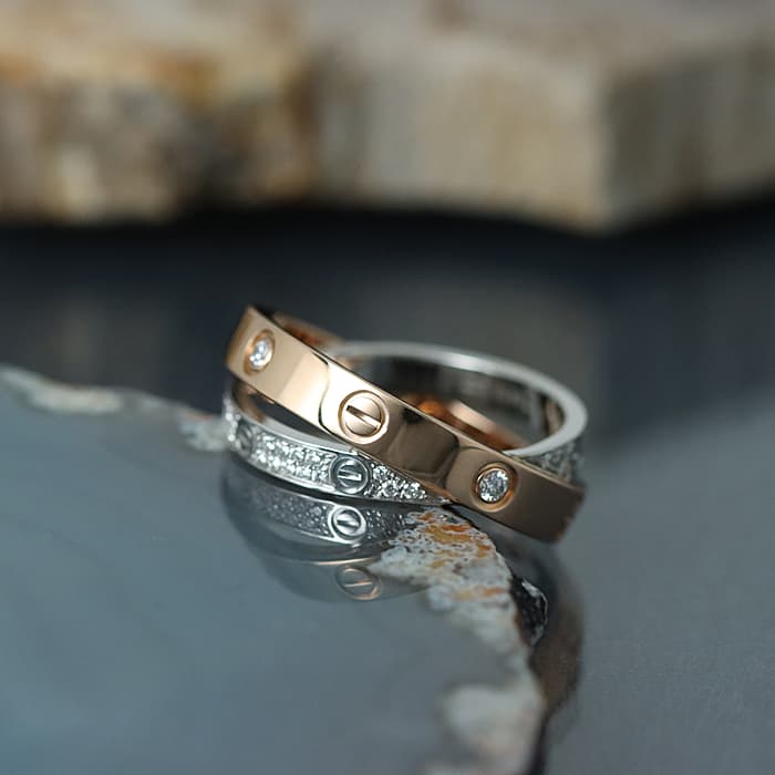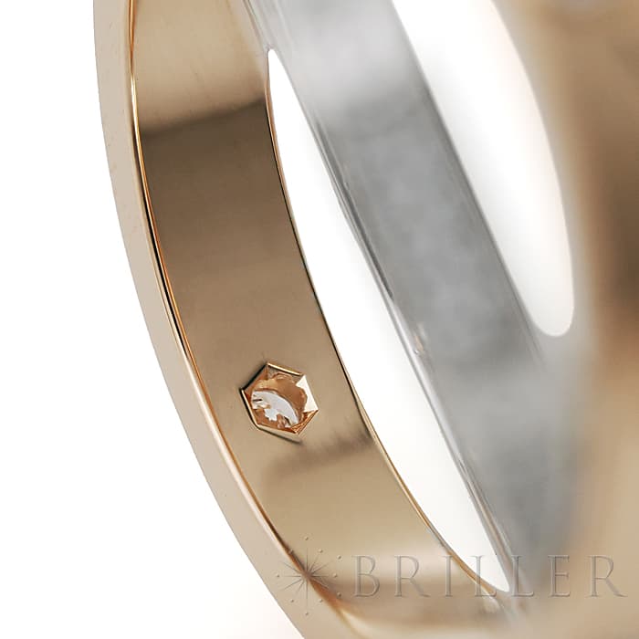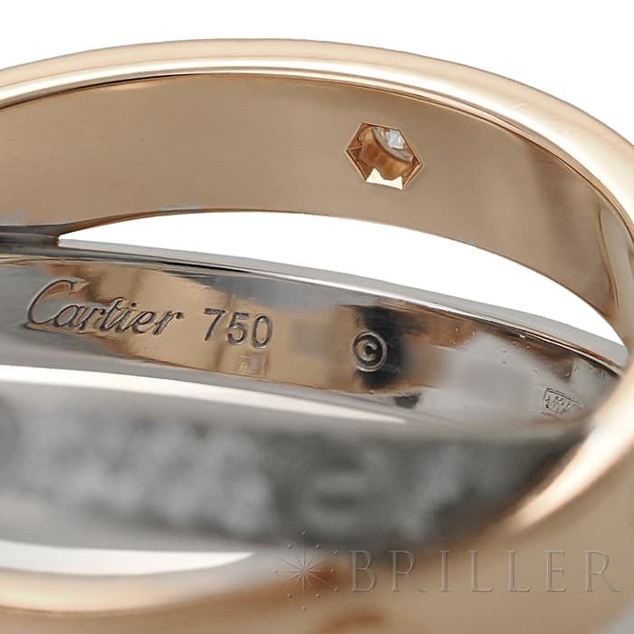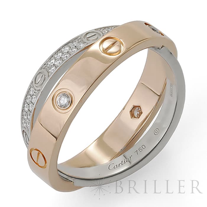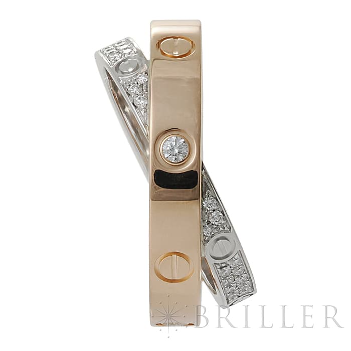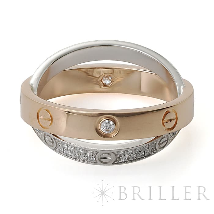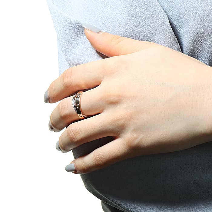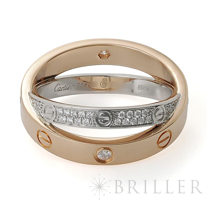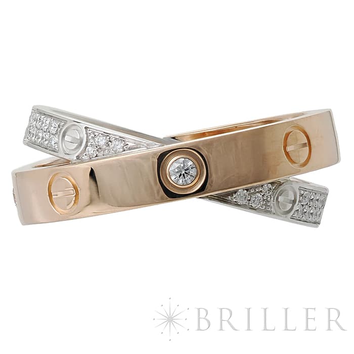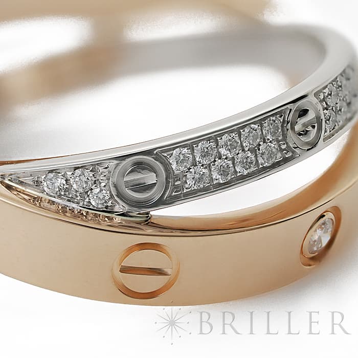 フランスを代表するジュエラーの一角である「カルティエ」。独創的なデザインや技術力の高さから圧倒的な支持を受けるブランドです。 ビスが等間隔に配置されたデザインは永遠の愛をモチーフにしたものです。2つのリングが重なり合った「ビーラブ リング」。 こちらはピンクゴールドとホワイトゴールドのコンビモデルであり、2種類のマテリアルが存在感を放ちます。ホワイトゴールドにはダイヤモンドがセッティングされており、トップジュエラーであるカルティエらしさを感じさせるラグジュアリーなリングとなっております。