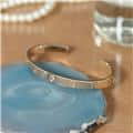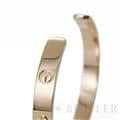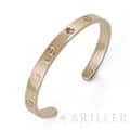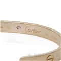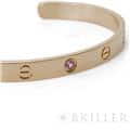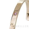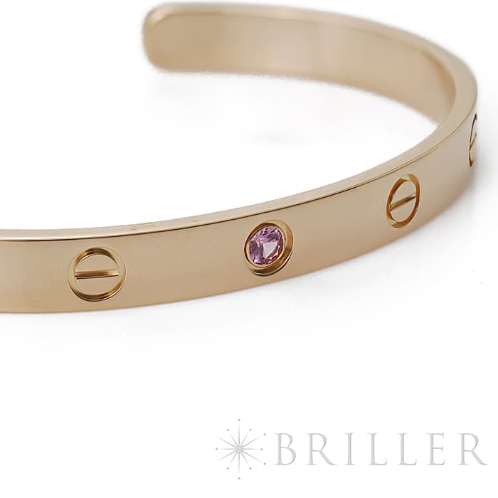 カルティエ ラブオープン バングル ピンクゴールド ピンクサファイア 17号 Cartier1969年にアルド・チプロによってデザインされ、1970年に誕生したラブブレスレット。ビスを付属のドライバーで留める斬新なデザインが話題になり、今では定番人気のジュエリーになっています。こちらはオープンバングルタイプで、シーンに合わせて身に着けることができる手軽さが魅力です。フォルム自体はシンプルなので、重ね付けにしてもおしゃれな手元になりそうです。1ポイントに入ったピンクサファイヤがアクセントになっています。 中古のお品物ではございますが、ライトポリッシュを行っておりますので、 ご着用時に気になるような傷はございません。 修理明細日付2023年12月
