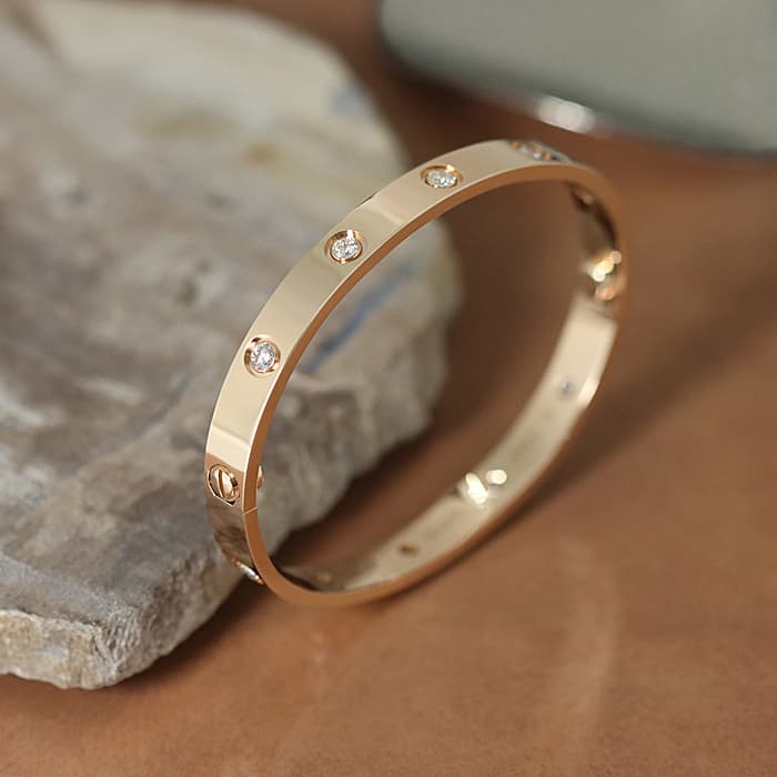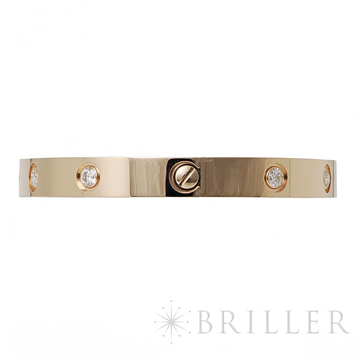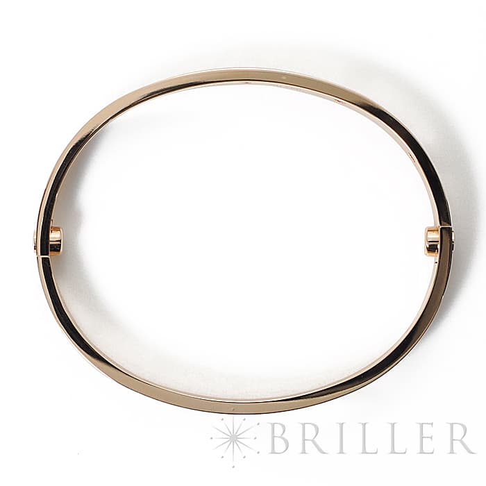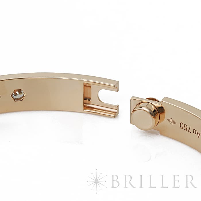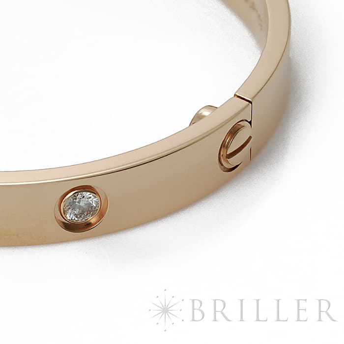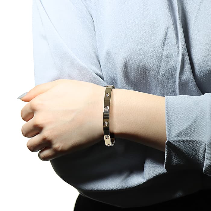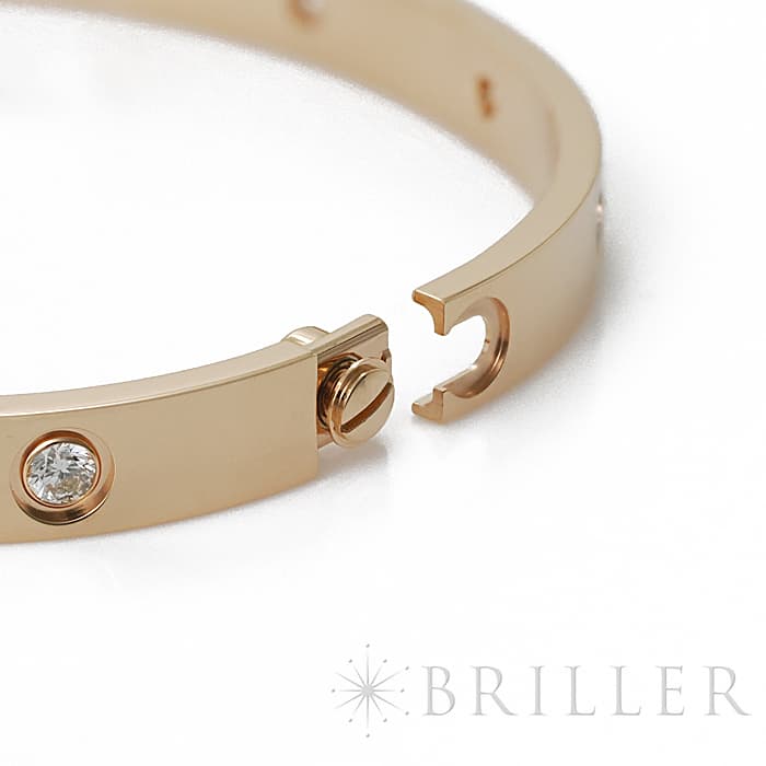 世界5大ジュエラーのひとつである「カルティエ」。1970年代にニューヨークで生まれたLOVE コレクションは、愛の絆を象徴するビスモチーフが特徴のコレクションです。こちらは肌馴染みの良いピンクゴールド素材にビスの代わりとしてブリリアントカットの贅沢なダイヤモンドを10ポイント配置、1本使いでも圧倒的な存在感を放つモデルとなっています。形状はバングル型でシンプルですので、ほかのジュエリーとの重ね付けにも違和感なくご使用いただけます。