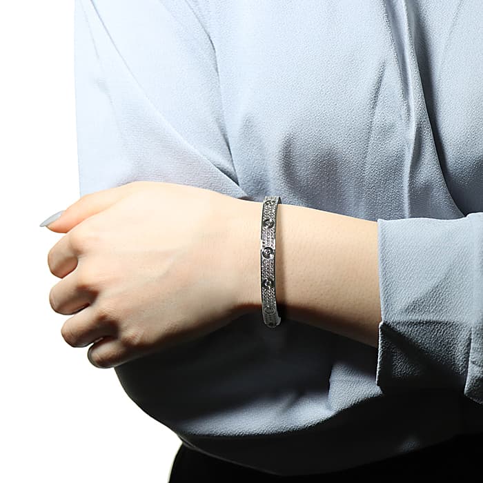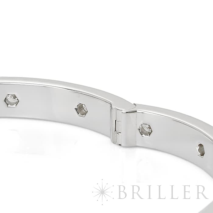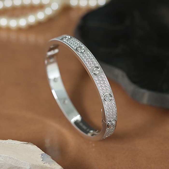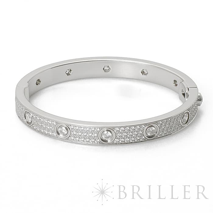 世界5大ジュエラーとして世界中から愛されるブランド「カルティエ」。カルティエが手掛ける「束縛」や「愛の絆」をテーマにして作られた「ラブコレクション」は、老若男女問わず不動の人気を博しています。こちらはホワイトゴールドのブレスレットの表面に、贅沢にパヴェダイヤモンドを配置し、更にビス部分にもダイヤモンドが配置された華やかでゴージャスなブレスレットです。煌びやかなダイヤと洗練された印象を与えるホワイトゴールドのリングがお手元を美しく飾ります。