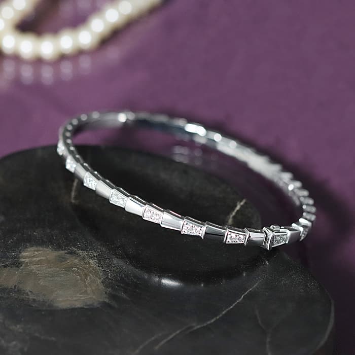 ブルガリを代表するアイコンであるセルペンティを、その洗練されたデザインが際立つよう再解釈して生み出された「セルペンティ ヴァイパー」。様式化された鱗のモチーフが連なる構造は、新たな蛇の魅力を大胆に表現しています。シンプルな構成ながらもホワイトゴールドとダイヤモンドが交互に輝く存在感のあるバングルです。