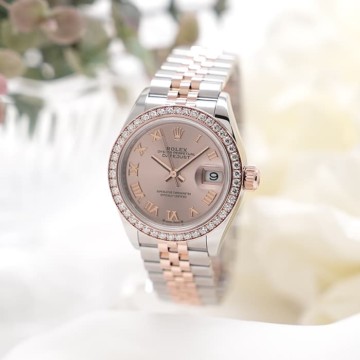 ステンレスとエバーローズゴールドのコンビモデル「デイトジャスト 279381RBR」。 ベゼルには無数のダイヤモンドがセッティングされ、たいへんラグジュアリーな雰囲気を演出しています。 ロゼカラーの文字盤には、クラシカルなローマインデックスがあしらわれ、夜光塗料が塗布されていないことで、格式の高さを感じさせる1本です。