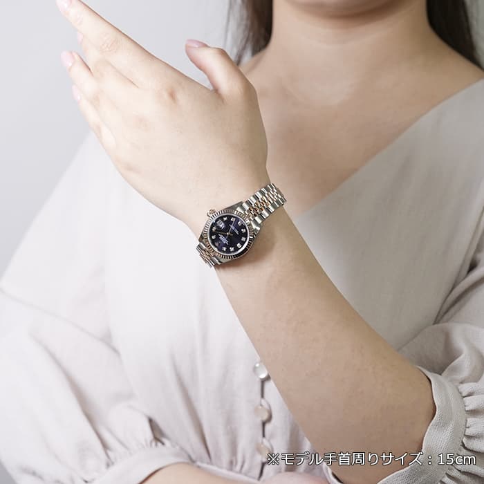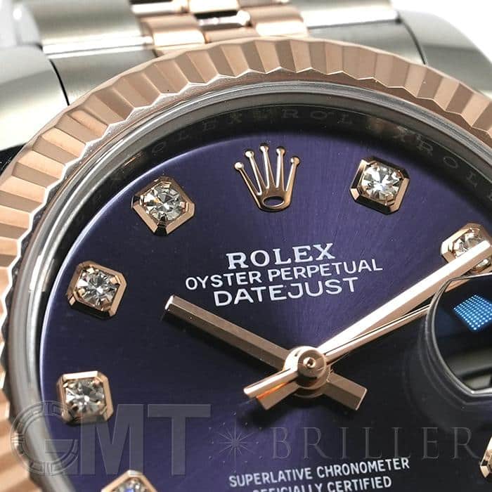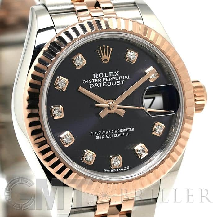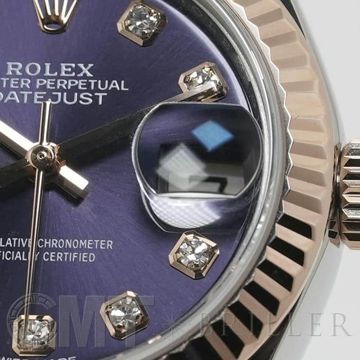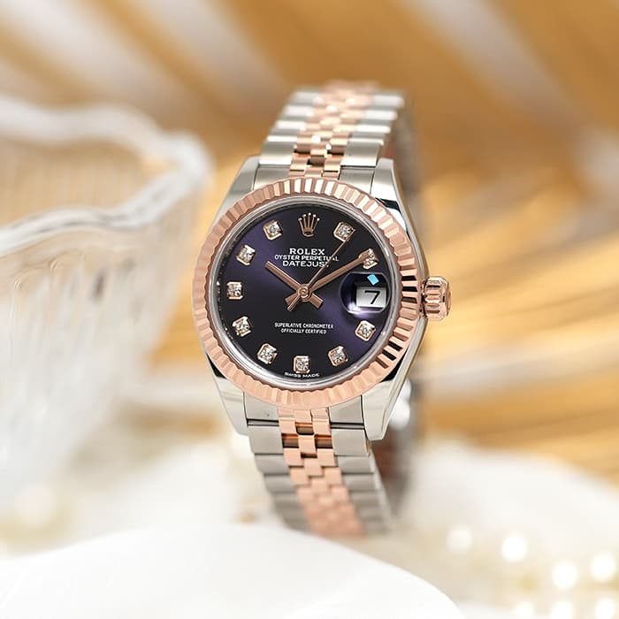 「179171」の後継モデルとして誕生した「デイトジャスト 279171」。 ロレックスが独自開発したエバーローズゴールド×ステンレスのモデルはフェミニンかつ華やかな印象を演出。また、ドレスウォッチらしい繊細なデザインと極上の着け心地を両立させるジュビリーブレスレットとフルーテッドベゼルの組み合わせは、光をキラキラと反射させ、ドレッシーに手元を彩ってくれます。ダイヤモンドインデックスが配された深みのあるパープルカラー「オーベルジーヌ」文字盤は気品に溢れ、ワンランク上の満足感を与えてくれる1本です。
