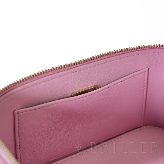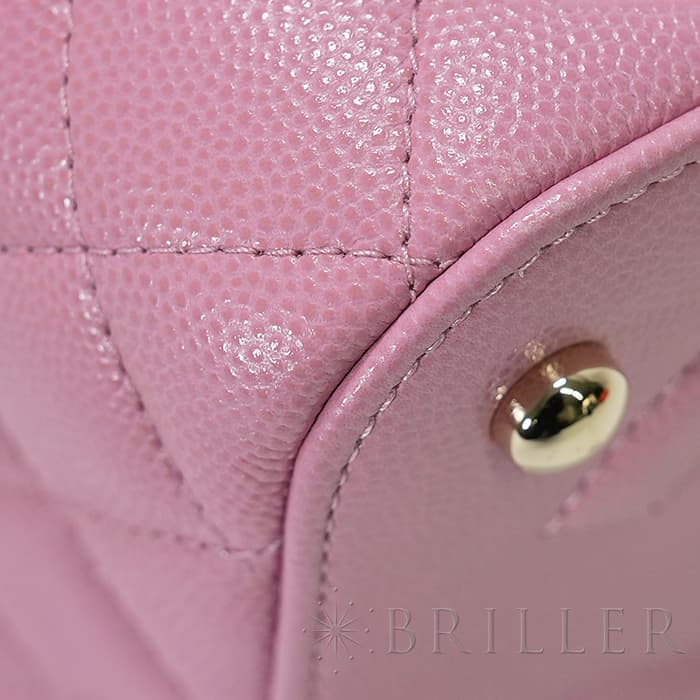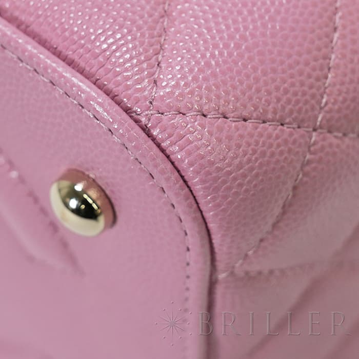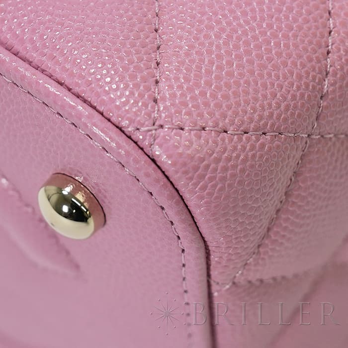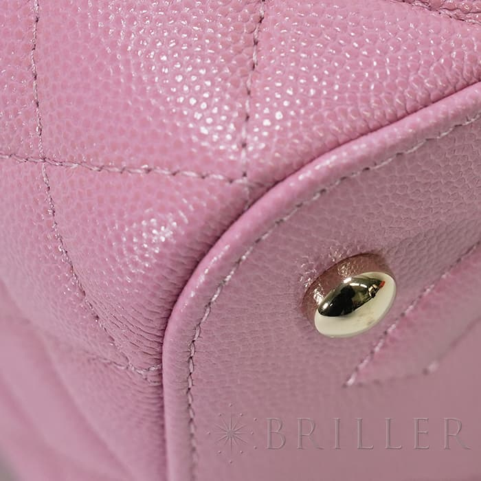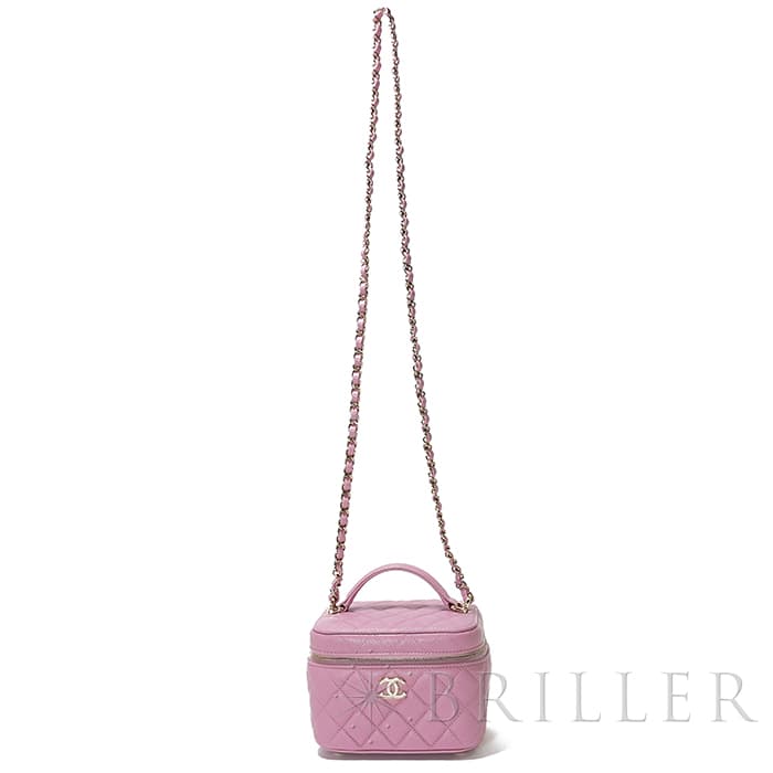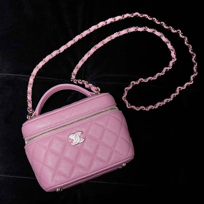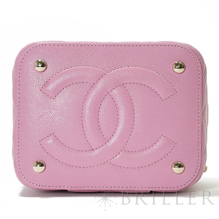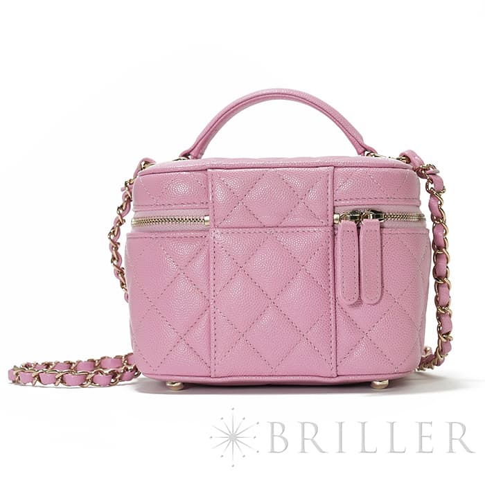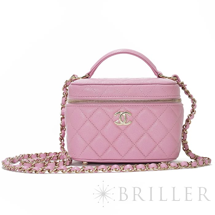 シャネルらしいアイコニックなデザインと持ち運びやすいコンパクトなサイズ感が特徴のスモールヴァニティケース。ショルダー付きでショルダバッグとしてもお使いいただけます。ピンクのキャビアスキンを使っており、ゴールドのココマークがアクセントになっています。底にも大きくココマークが入っており、とてもかわいいバッグです。