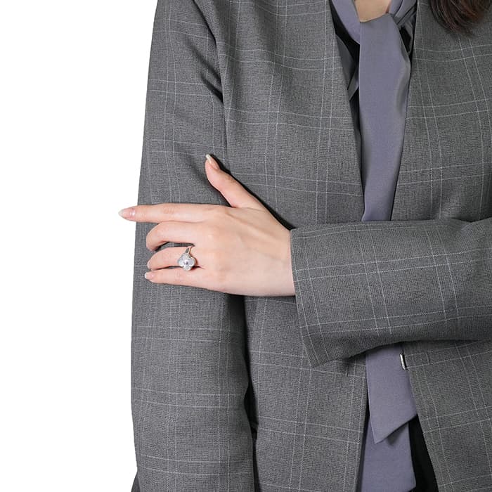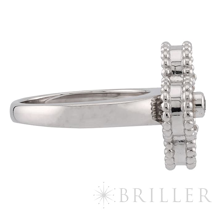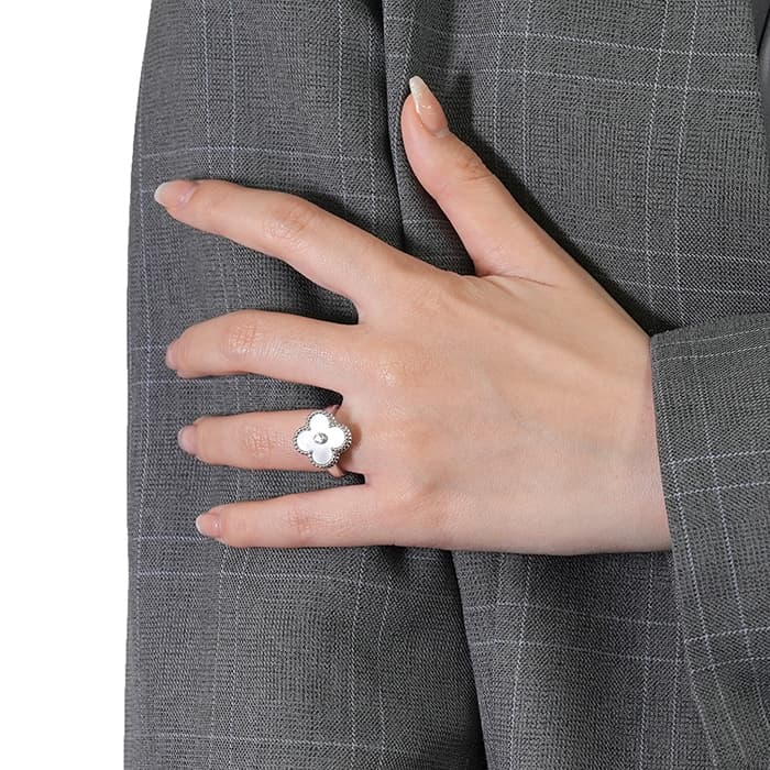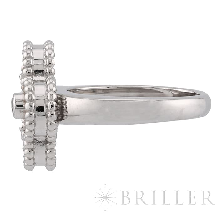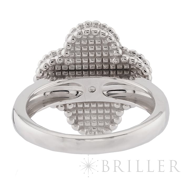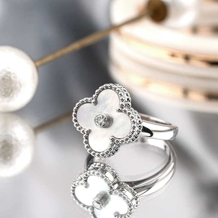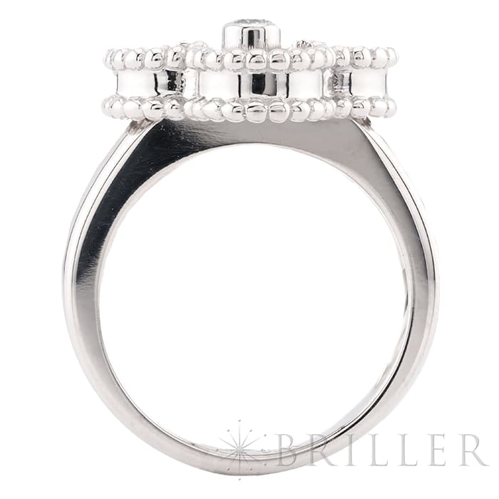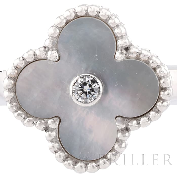 ヴァンクリーフ&アーペルの象徴とも言える「アルハンブラ」コレクション。 ヴィンテージは、アルハンブラの4サイズのうち2番目に小さな大きさで、石の種類やデザインが豊富にあります。 ゴールドビーズの内側はホワイトゴールドと調和のとれたマザーオブパールが使用され、動きによってその表情が変わります。 リング中央の1粒ダイヤが入ることにより、さらなる高級感を感じさせます。