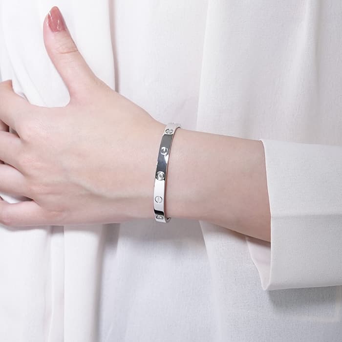 世界5大ジュエラーのひとつである「カルティエ」。1970年代にニューヨークで生まれたLOVE コレクションは、愛の絆を象徴するビスモチーフが特徴のコレクションです。こちらはホワイトゴールド素材にビスの代わりとしてブリリアントカットの贅沢なダイヤモンドを6ポイント配置、1本使いでも圧倒的な存在感を放つモデルとなっています。形状はバングル型でシンプルですので、ほかのジュエリーとの重ね付けにも違和感なくご使用いただけます。