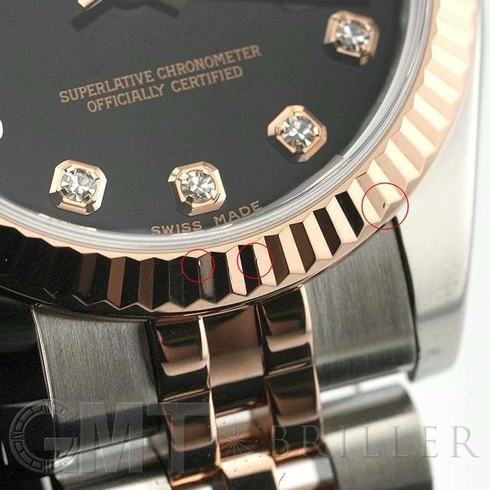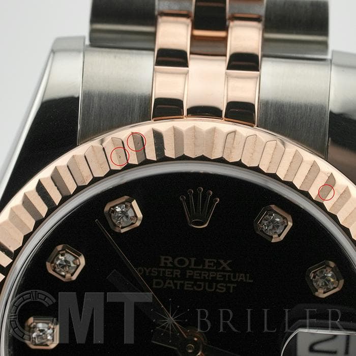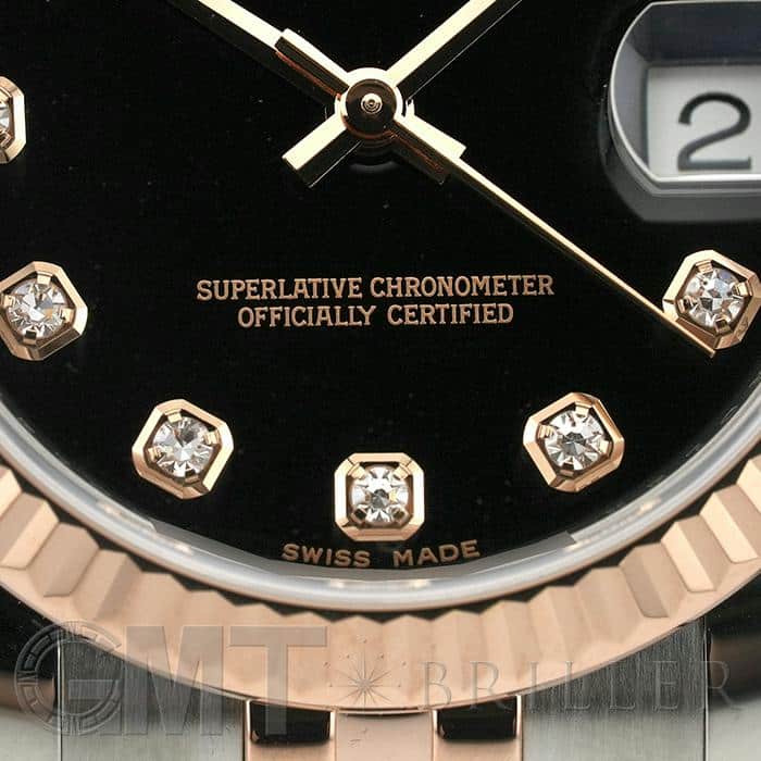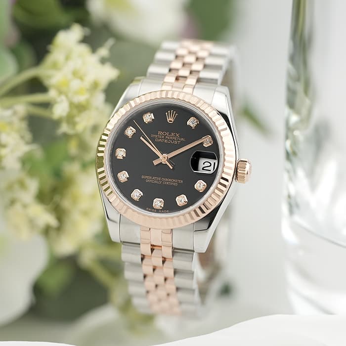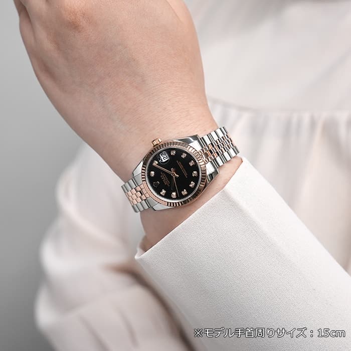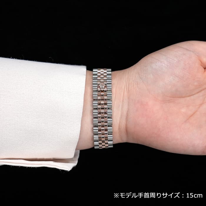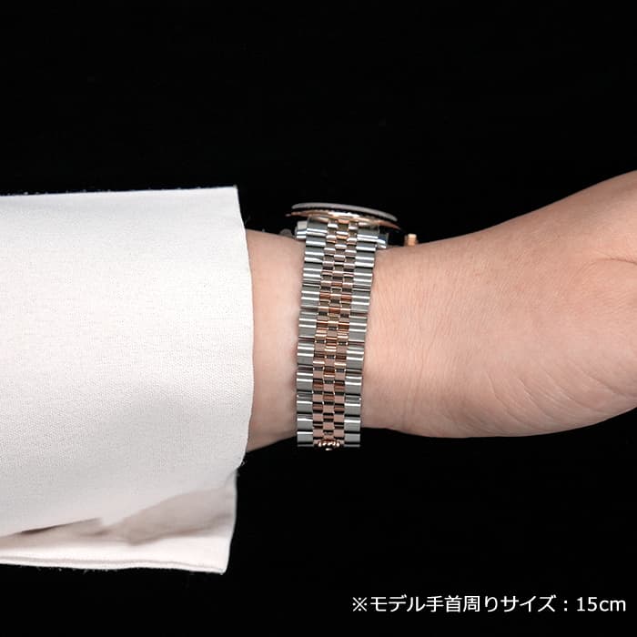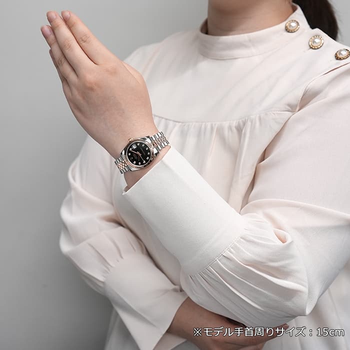 フルーテッドベゼルやジュビリーブレスレットといった一目でロレックスとわかるデザインに加え、バックルがないように見える「コンシールドクラスプ」により、エレガントなモデルに仕上がっています。 26mmの「179171」よりもひと回り大きいため存在感があり、インデックスにセッティングされた10ポイントのダイヤモンドがラグジュアリーな雰囲気を演出する腕時計です。