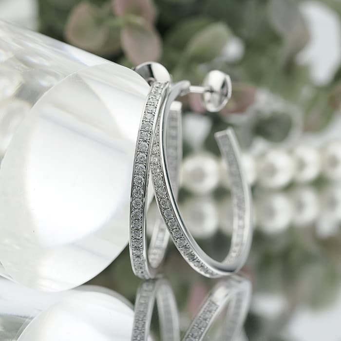 フランスを代表するジュエラーの一角である「カルティエ」。独創的なデザインや技術力の高さから圧倒的な支持を受けるブランドです。クラシカルなフープピアスにダイヤモンドをセッティングした高級感あふれるピアスです。