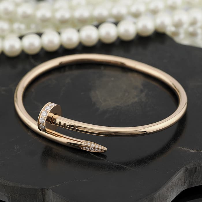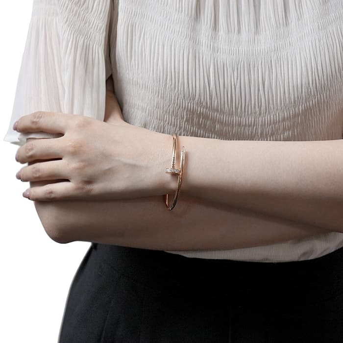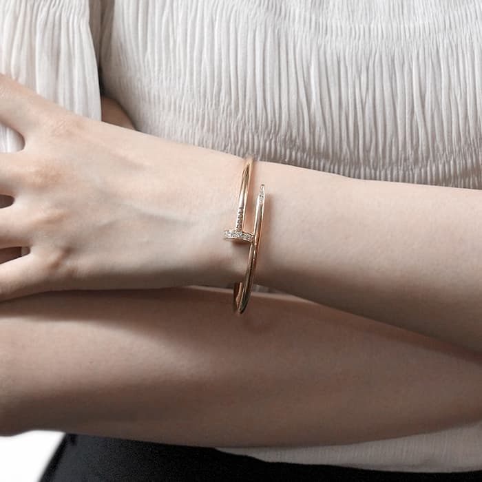 フランスで誕生し、独創的なデザインや技術力の高さから圧倒的な支持を受けるブランド『カルティエ』。「1本の釘」という意味を持つコレクション『ジュスト アン クル』が入荷いたしました。大胆かつモダンなデザインのピンクゴールドブレスレットは、適度な力強さと美しさを兼ね揃えています。ヘッドの周りと先端にダイヤモンドが輝き、シンプルでありながらエレガントな装いにも映える一品です。