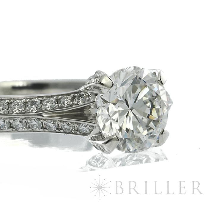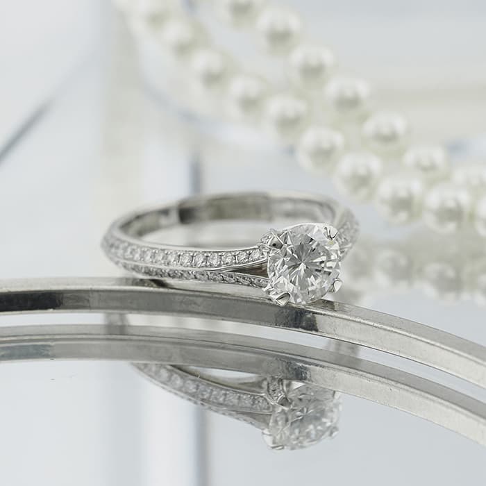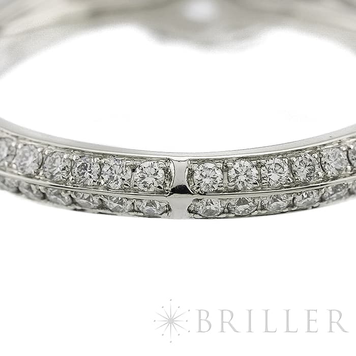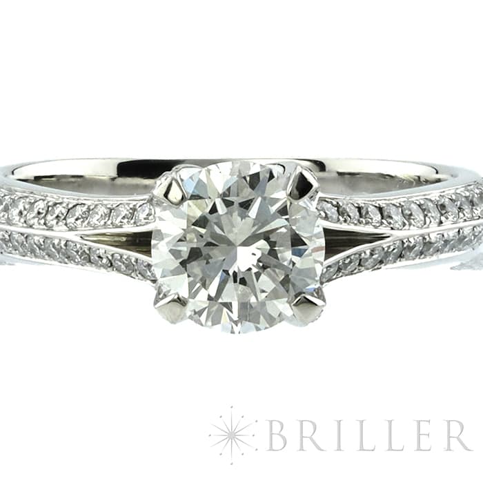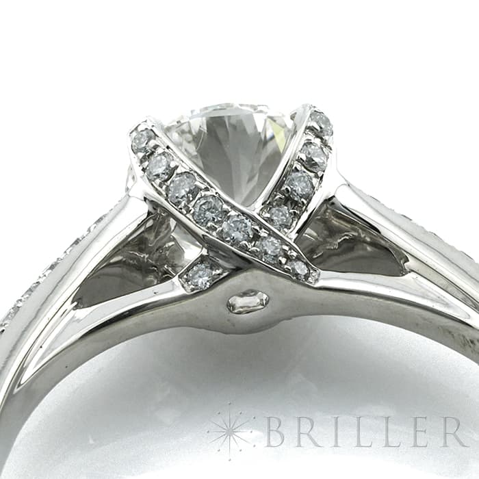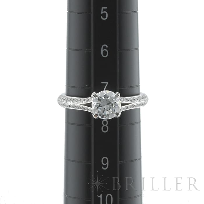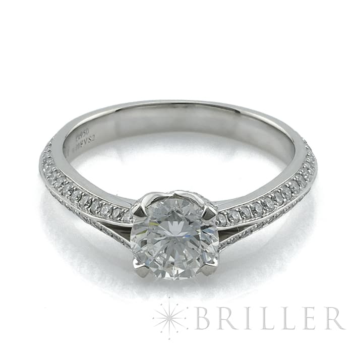 鉱山から女性を飾るジュエリーまで」の理念を掲げるるイギリスのジュエラー「GRAFF(グラフ)」。徹底した品質管理のもと販売されるダイヤモンドは、「キング・オブ・ダイヤモンド」と称されるハリーウィンストンとも肩を並べるほどです。センターの0.90ctのラウンド カット ダイヤモンドが2本の印象的なシャンクによってこの上ない輝きを放ちます。