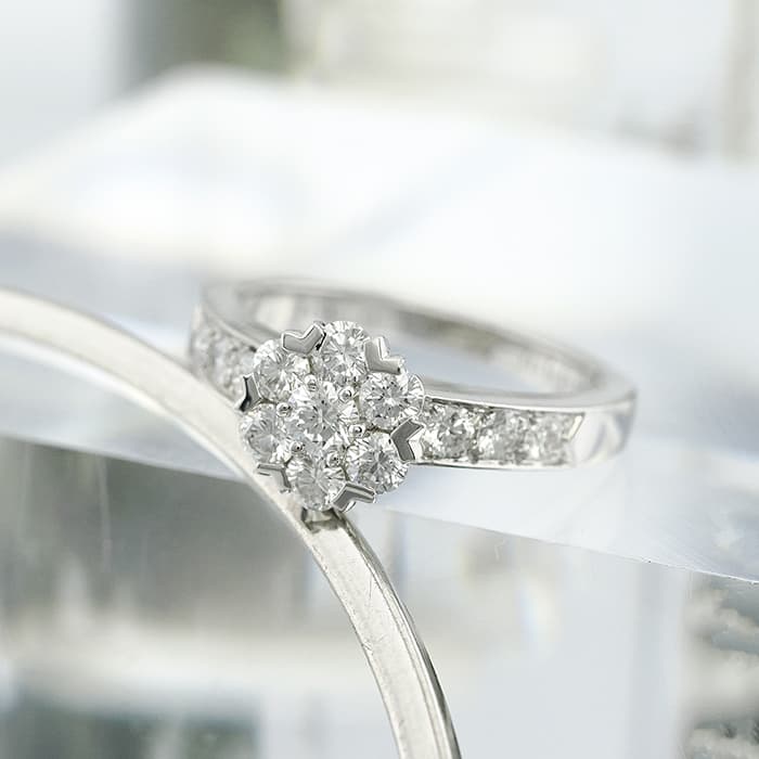 1906年に誕生したフランスのハイジュエラー「ヴァンクリーフ&アーペル」。花びらをイメージした「フルーレット」モチーフは、1920年代から受け継がれる伝統的なモチーフです。7石のラウンドカットダイヤモンドによってまばゆい花冠を表現しており、両脇にセッティングされた計6つのサイドストーンが、その美しさを引き立てます。
