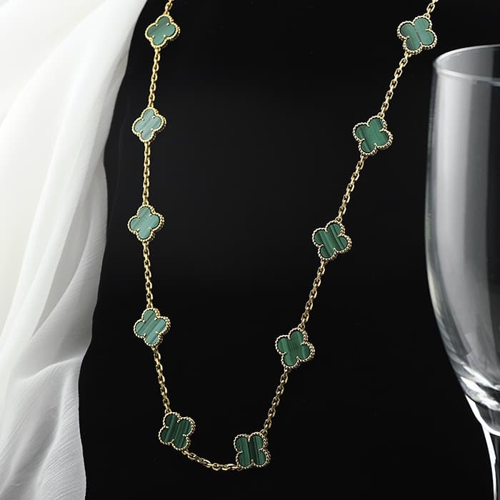 1902年にパリのヴァンドーム広場から始まった世界5大ブランドの1つ、ヴァンクリーフ&アーペル。ヴァンクリーフ&アーペルの象徴とも言える、幸運の象徴の四つ葉のクローバーをデザインした「アルハンブラ」コレクション。 ロングネックレスのこちらは、20個ものアルハンブラモチーフが使用されており、どこから見てもアルハンブラが存在感たっぷりに、コーディネートに華やかさと可愛らしさをプラスします。2連にして着ければ、格別のラグジュアリーな雰囲気を楽しめます。 イエローゴールドとマラカイトの組み合わせが高貴な雰囲気すら漂わせ、大人の品格を感じさせる特別感たっぷりのジュエリーです。