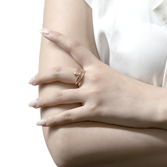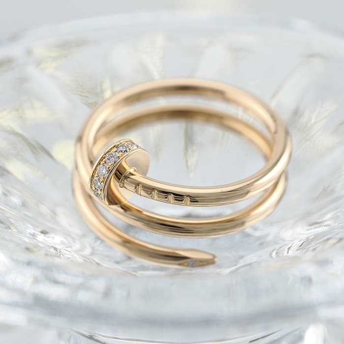 フランスで誕生し、独創的なデザインや技術力の高さから圧倒的な支持を受けるブランド「カルティエ」。1本の釘から誕生したジュエリー「ジュスト アンクル」は刺激的かつ力強さのあるコレクションです。肌なじみのよいピンクゴールドにダイヤモンドをセッティングしたこちらのリングは、エッジの効いた個性派ジュエリーとしておすすめです。