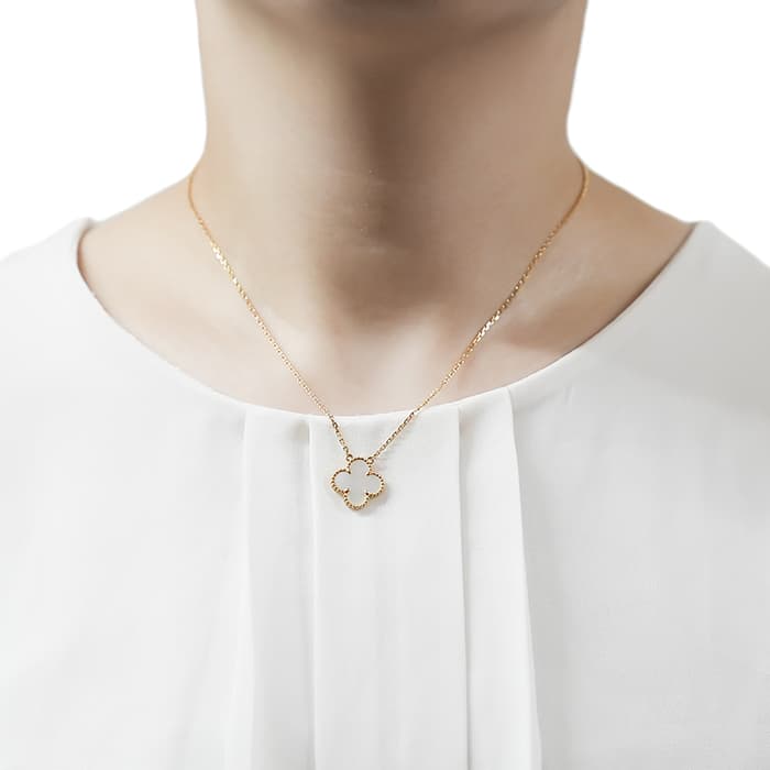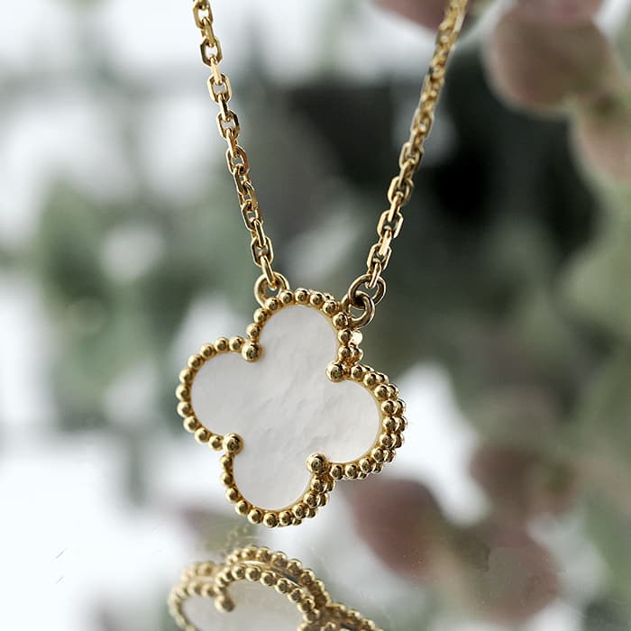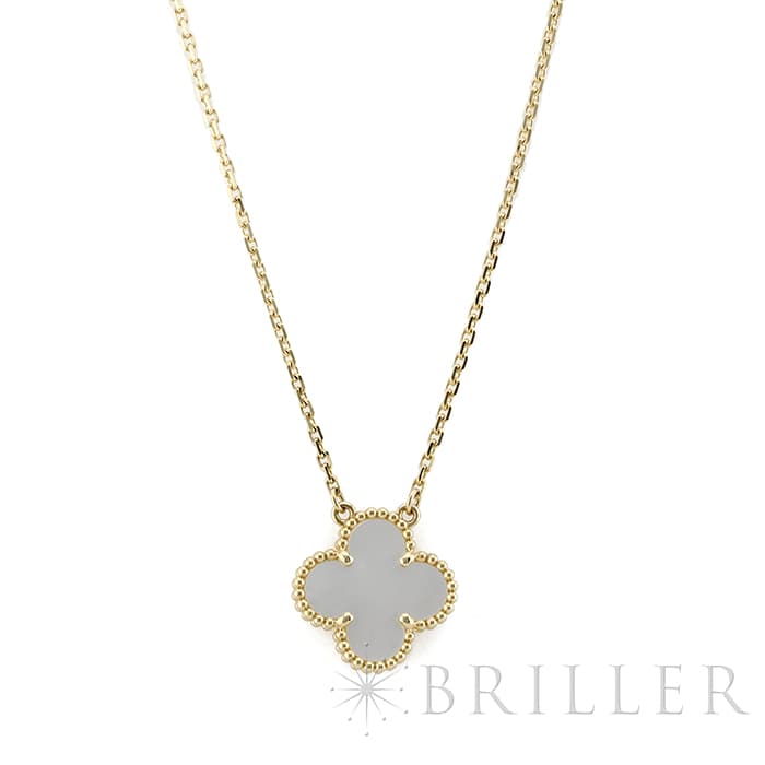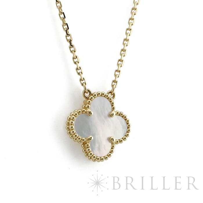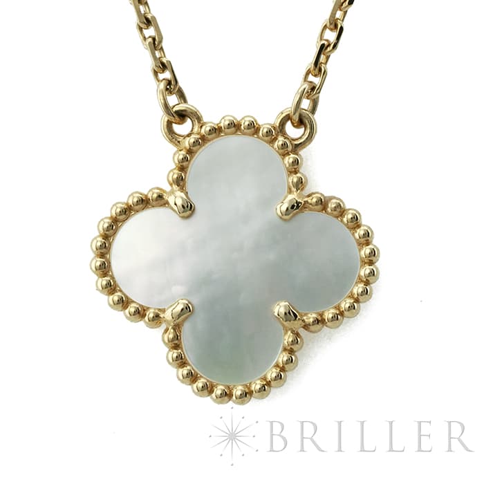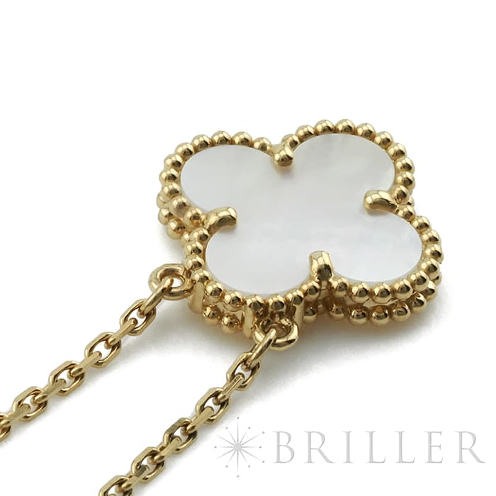 フランスに本店のある宝石、時計、香水を扱うハイジュエラー「ヴァンクリーフ&アーペル」。1906年に誕生し、数多くのセレブリティから愛されているブランドとなります。定番モデル「アルハンブラ」には複数のサイズ展開があり、こちらは「 ヴィンテージ アルハンブラ」と呼ばれる最もベーシックなモチーフです。アルハンブラを囲んでいるゴールドのビーズが大きく、厚みがあります。上品なホワイトのマザーオブパールを華やかなイエローゴールドが囲むネックレスです。