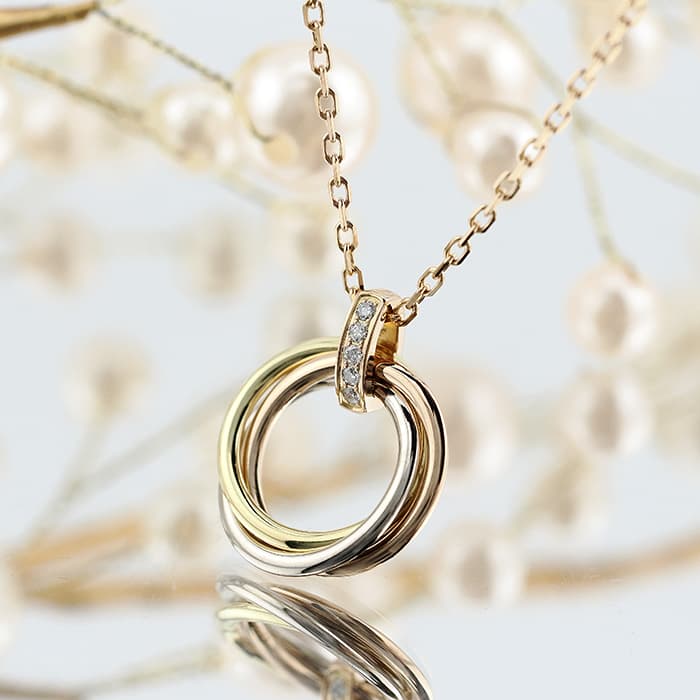 フランスで誕生し世界五大ジュエラーの一角である「カルティエ」。独創的なデザインや技術力の高さから圧倒的な支持を受けるブランドです。トリニティは英語で「3重、3つ組、3つ」を意味しその名の通り3つのゴールドが連なったデザインが特徴的。3つをまとめるつなぎ部分にはダイヤモンドがセッティングされ上品な印象を与えます。