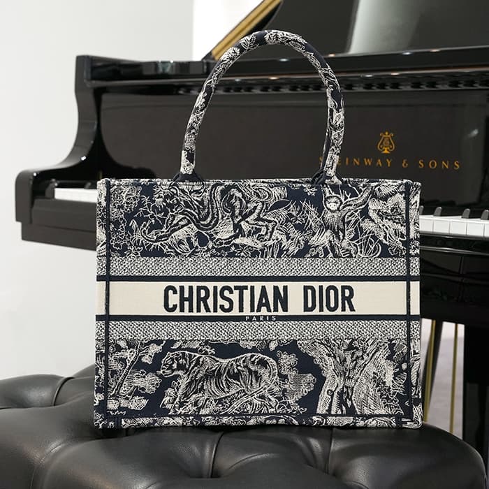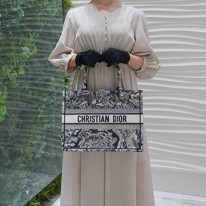 フランスのファッションデザイナー クリスチャン・ディオールが1946年パリで創立したファッションブランドを展開するクリスチャン・ディオール。ディオールのデザイナー、マリア・グラツィア・キウリが書店のトートバッグから着想を得て作成されたディオール新定番「ブックトート バッグ」。素材はエンブロイダリーキャンバスでブルーの「リバース トワル ドゥ ジュイ」モチーフが全面に刺繍されており、中央にはChristian Dior Parisシグネチャーがデザインされています。ミニ、スモール、ミディアム、ラージの4つのサイズ展開がされており、ミディアムはノートパソコンを収納でき一日中活躍するサイズ感です。