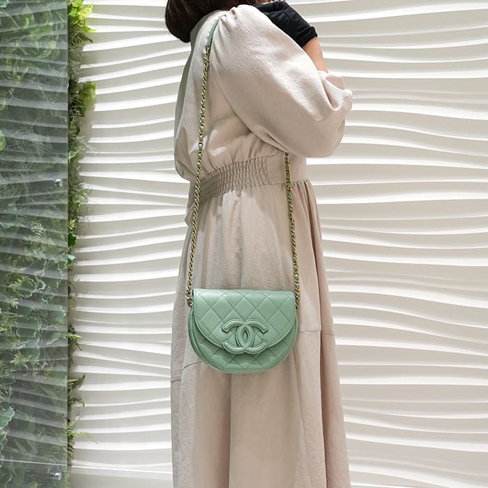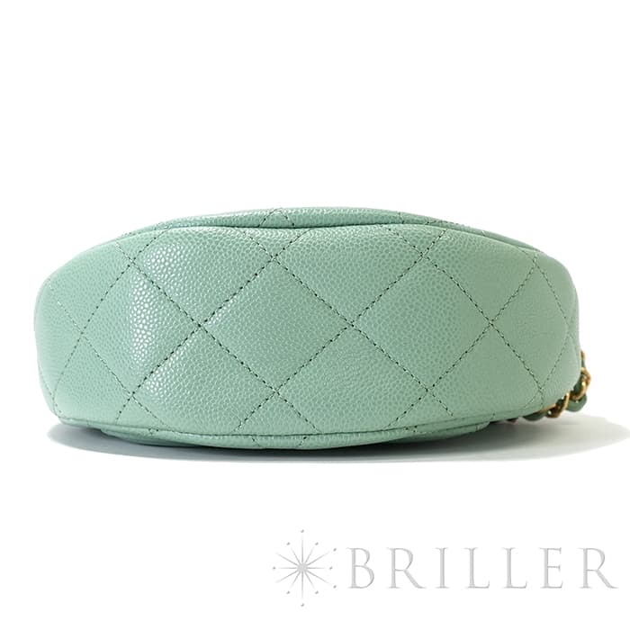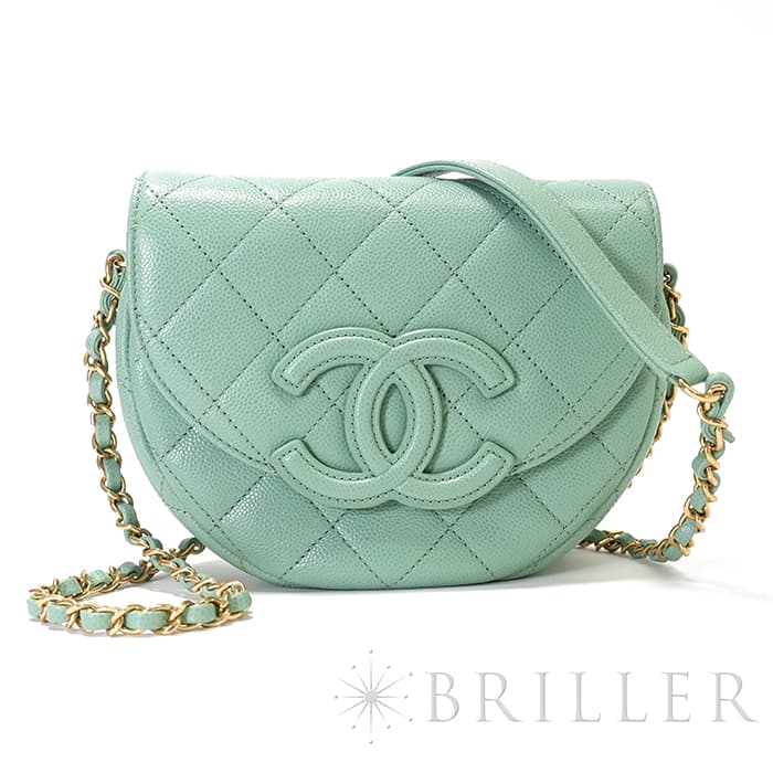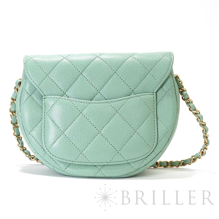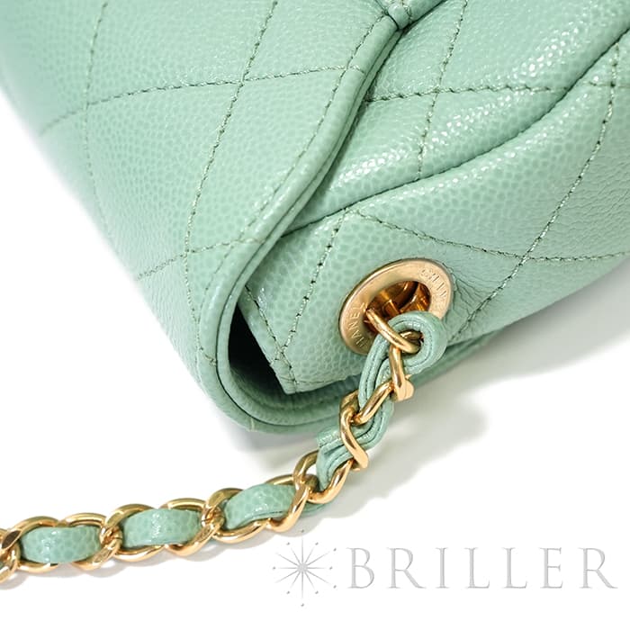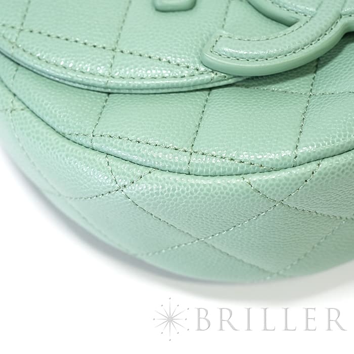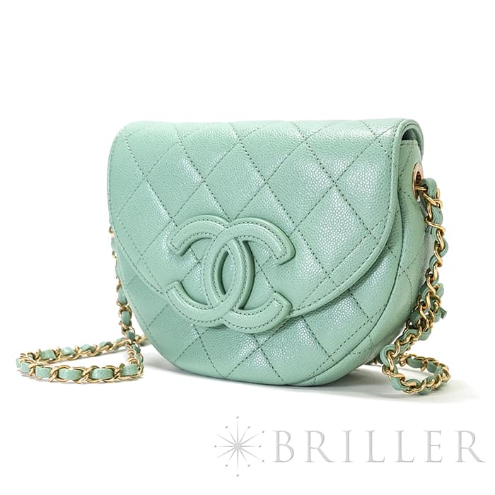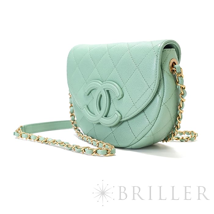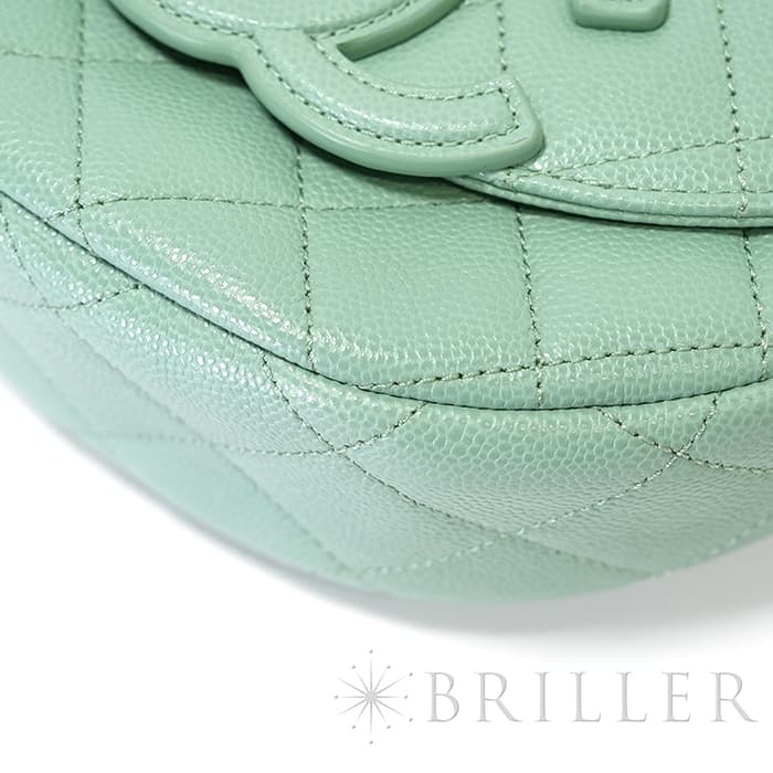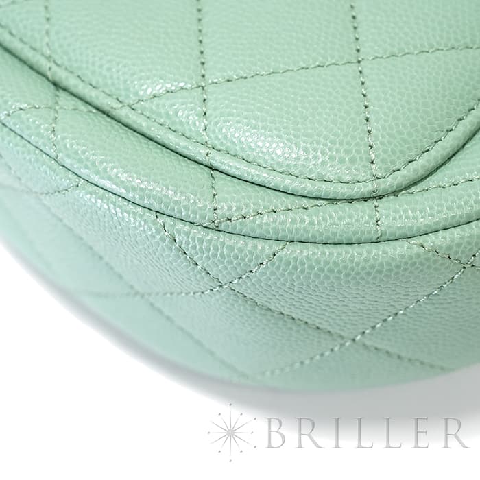 シャネルを象徴するキルティング加工がされたキャビアスキンに大きくあしらわれたココマークが印象的なミニメッセンジャーバッグ。爽やかなライトグリーンに高級感のあるゴールドのチェーンストラップの組み合わせです。型崩れしにくくなる効果があるキルティング加工は、リッチな質感だけでなく、デイリーユースしやすい実用性をも実現しています。