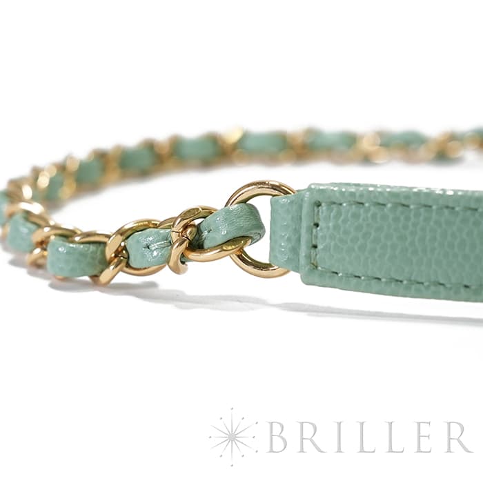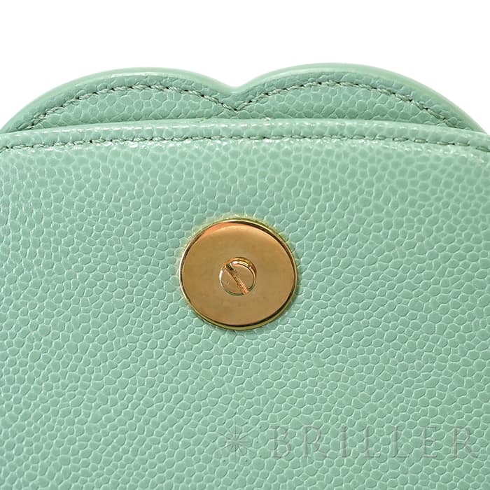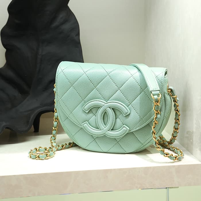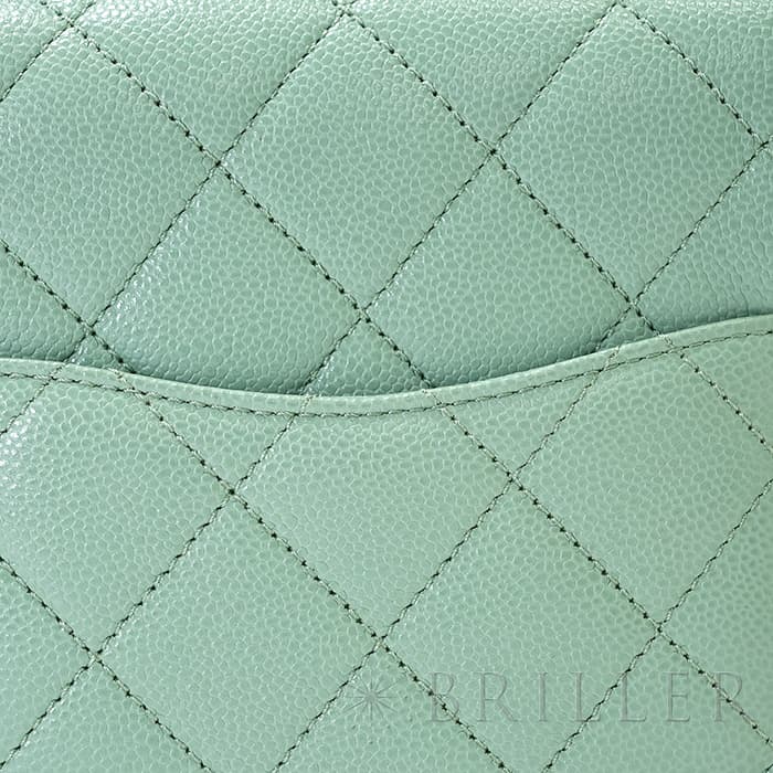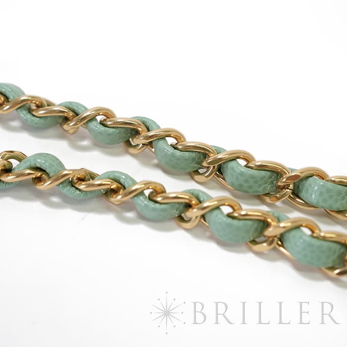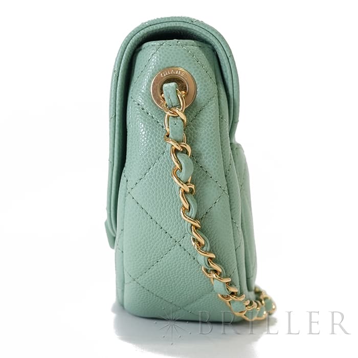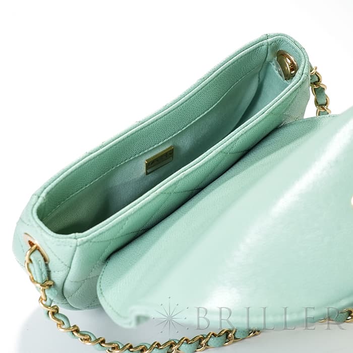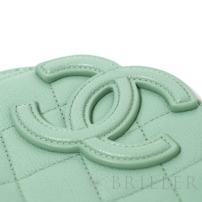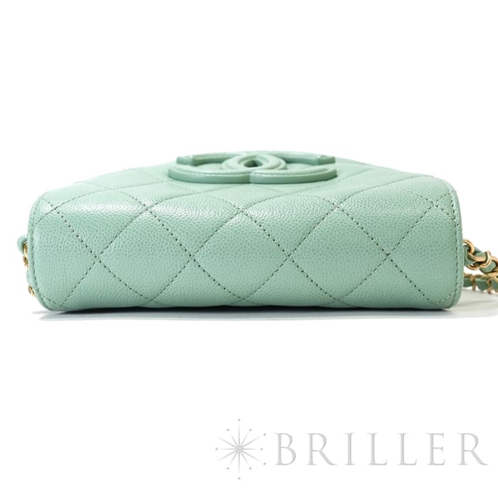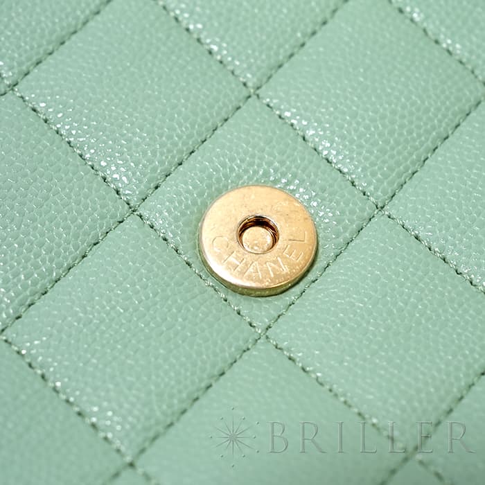 シャネルを象徴するキルティング加工がされたキャビアスキンに大きくあしらわれたココマークが印象的なミニメッセンジャーバッグ。爽やかなライトグリーンに高級感のあるゴールドのチェーンストラップの組み合わせです。型崩れしにくくなる効果があるキルティング加工は、リッチな質感だけでなく、デイリーユースしやすい実用性をも実現しています。