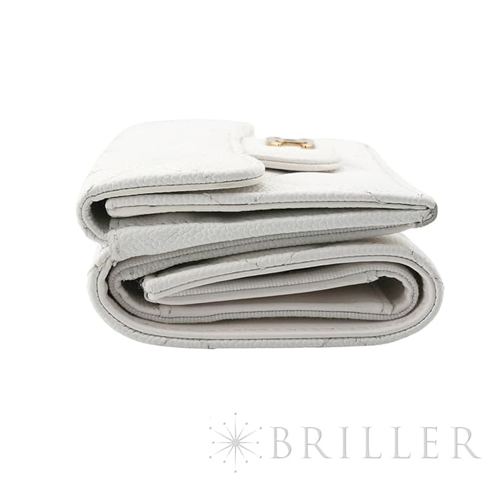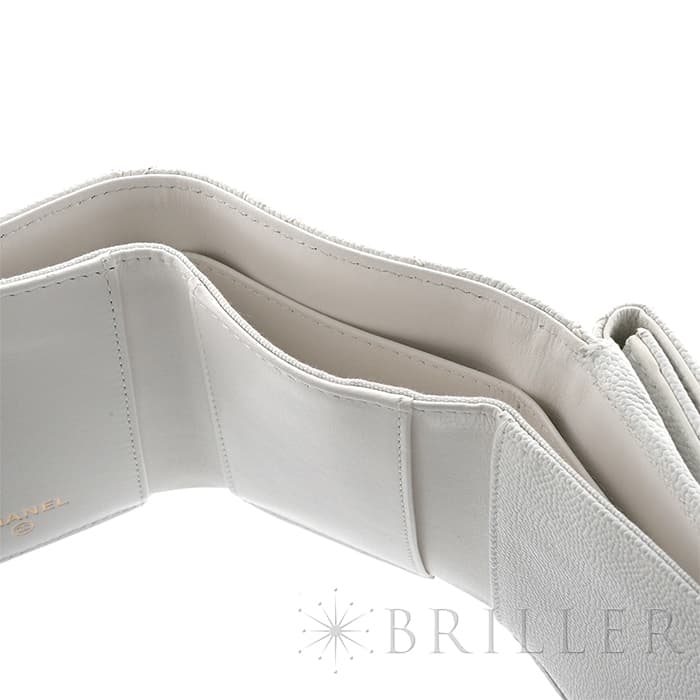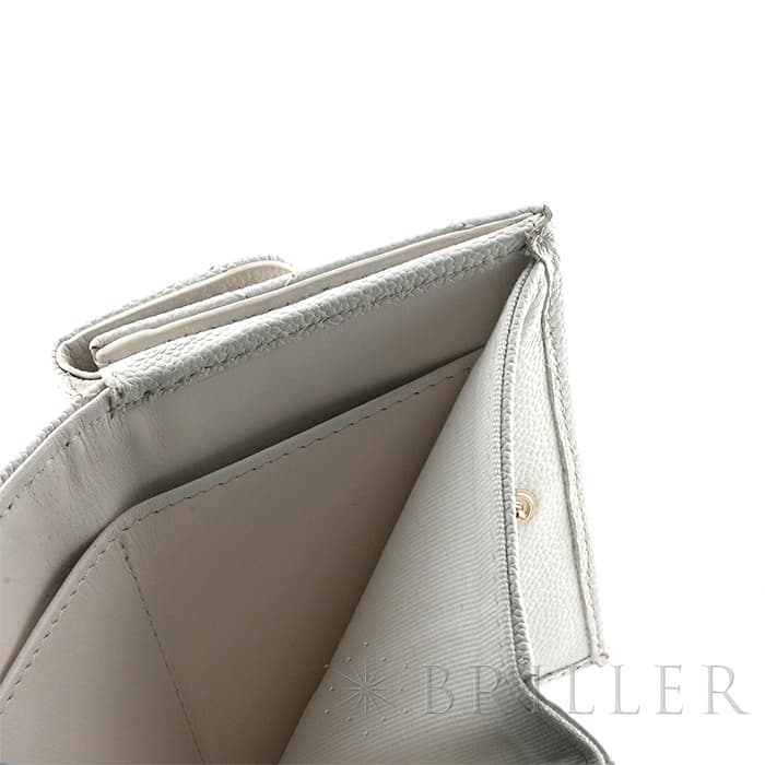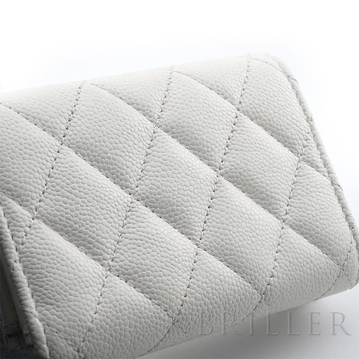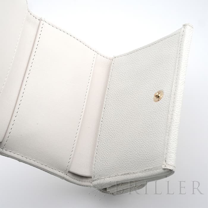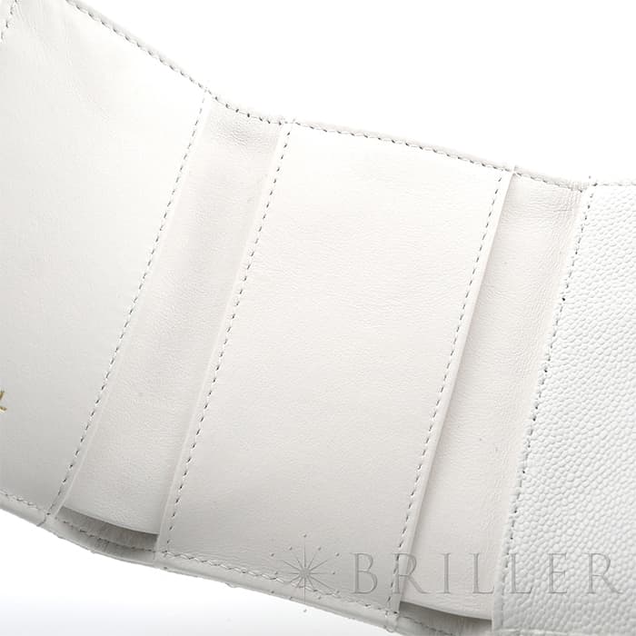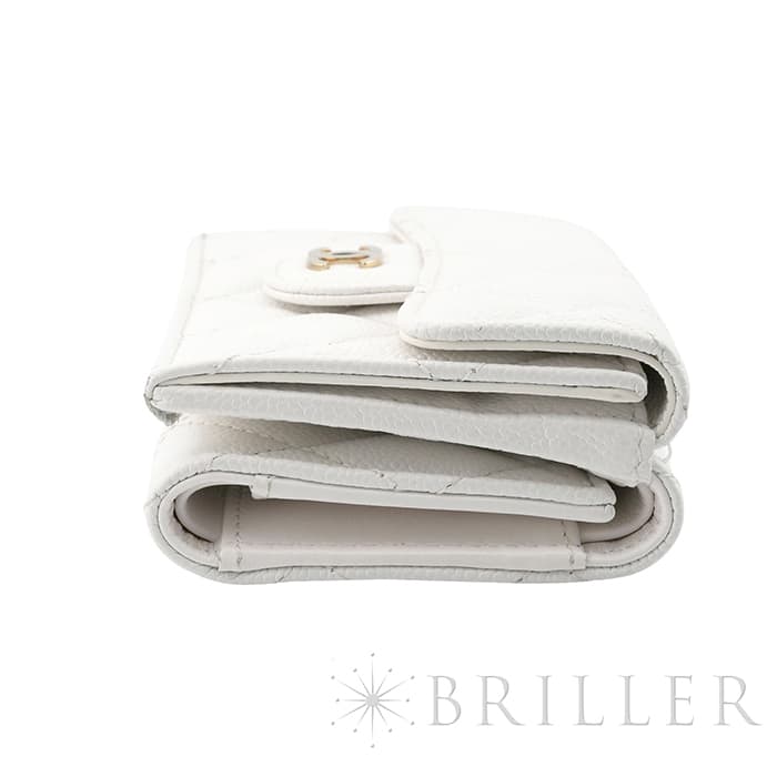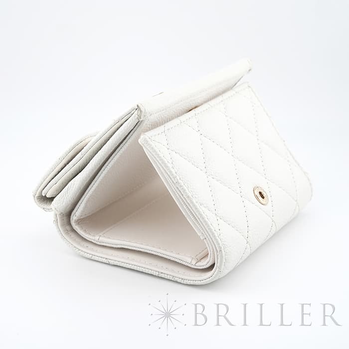 ホワイトのグレインド カーフスキンを使用したスモール フラップ ウォレット。キルティングのふっくらとした風合いをより際立たせる、柔らかな質感が特徴です。人気のミニバッグに対応できるほどよいサイズ感ながら、三つ折りになっており、札入れ、カードポケット、小銭入れが付き、しっかり収納が出来ます。