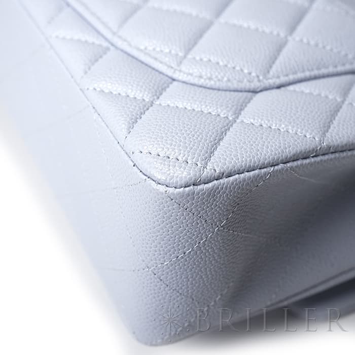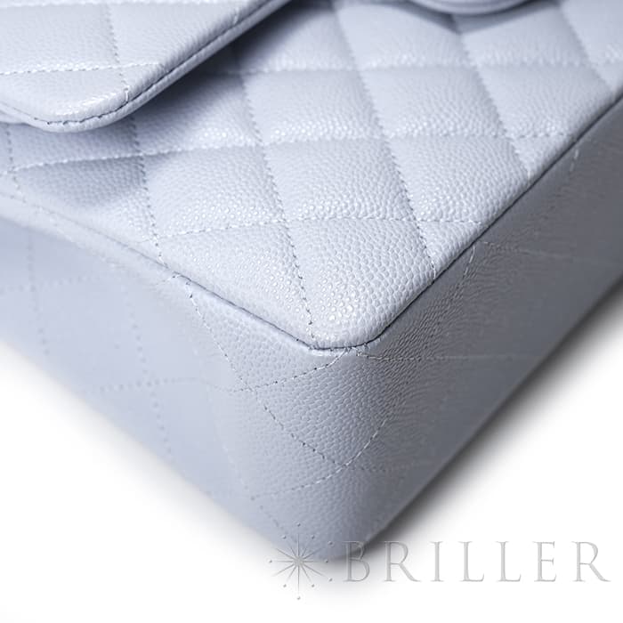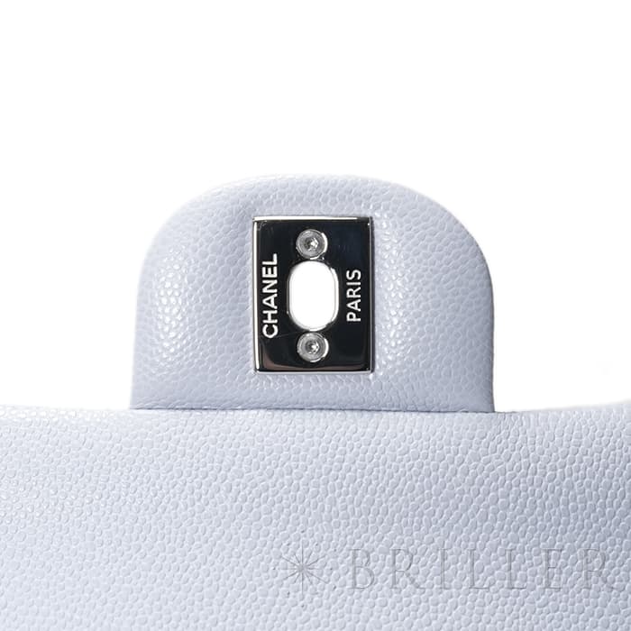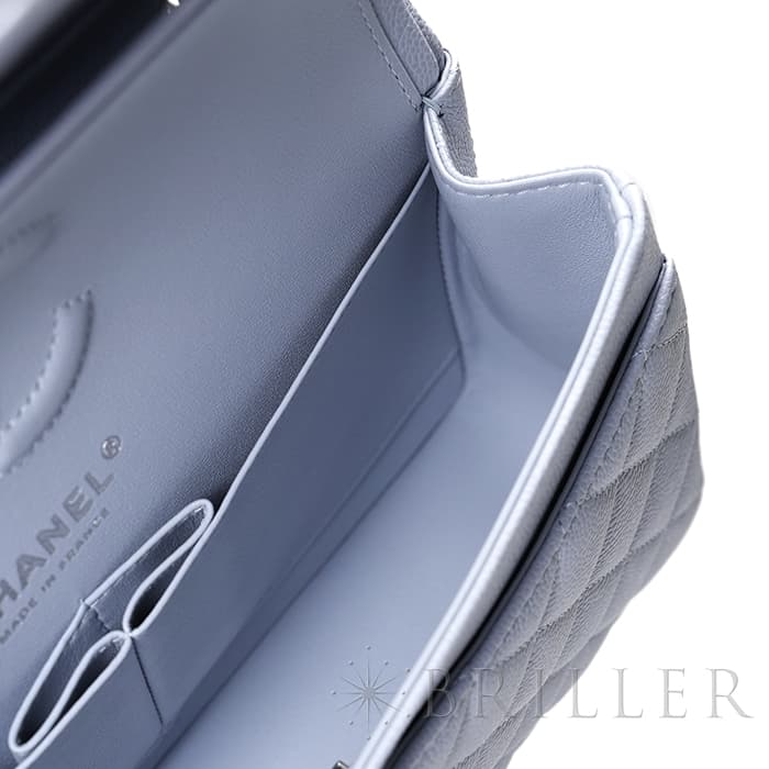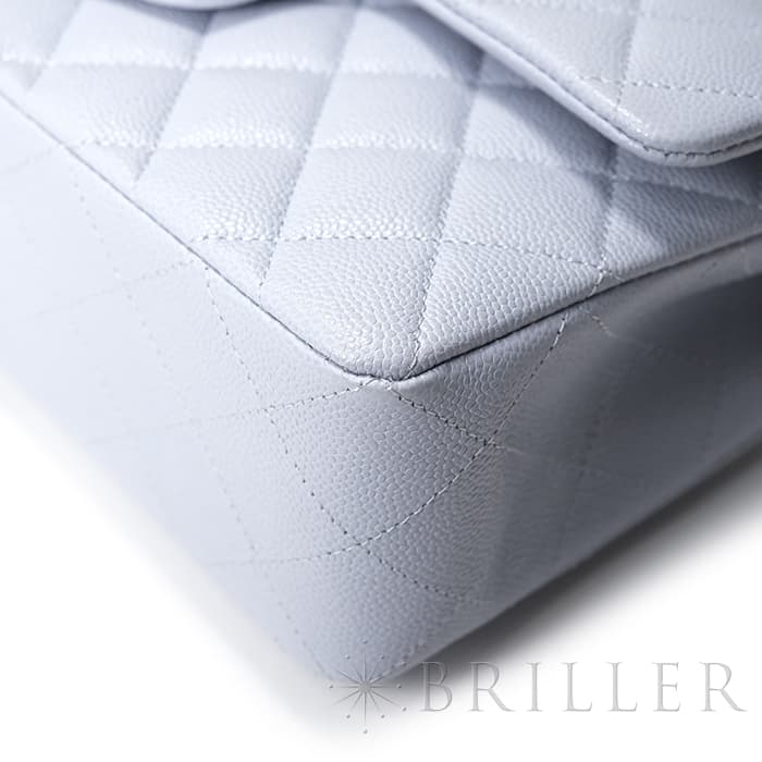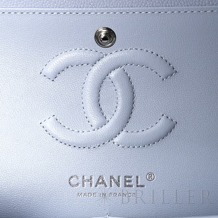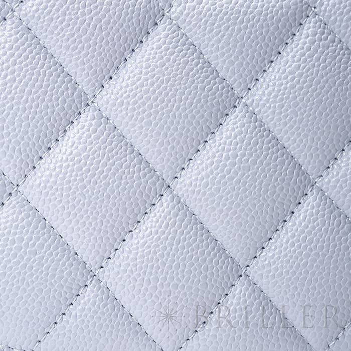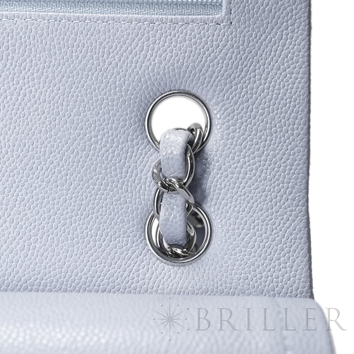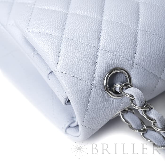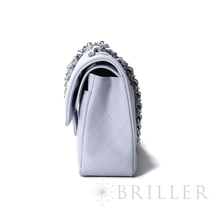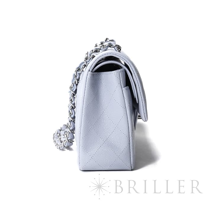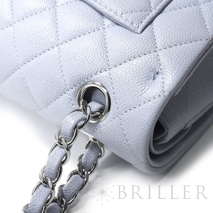 クラシックは、1955年に発表された初代モデル「2.55」を1983年に再デザインした伝統的なモデルです。ふっくらとしたキルティングが特徴の「マトラッセ」は、多くのシャネルのバッグのディテールに起用されています。バッグの前面には、今ではアイコンとなっている2つのCを掛け合わせた「ココマーク」をあしらったデザインが施されています。チェーンストラップは、ダブルで持ち手を短くしたり、シングルで肩掛けにしたり、スタイルに応じて長さを調節することができます。素材には傷や汚れに強いグレインド カーフスキンを使用。キルティング加工を施すことで型崩れしにくくなり、リッチな質感だけでなく、デイリーユースしやすい実用性をも実現しています。珍しいライトブルーにシルバー金具は年齢や季節を問わずご愛用いただけます。