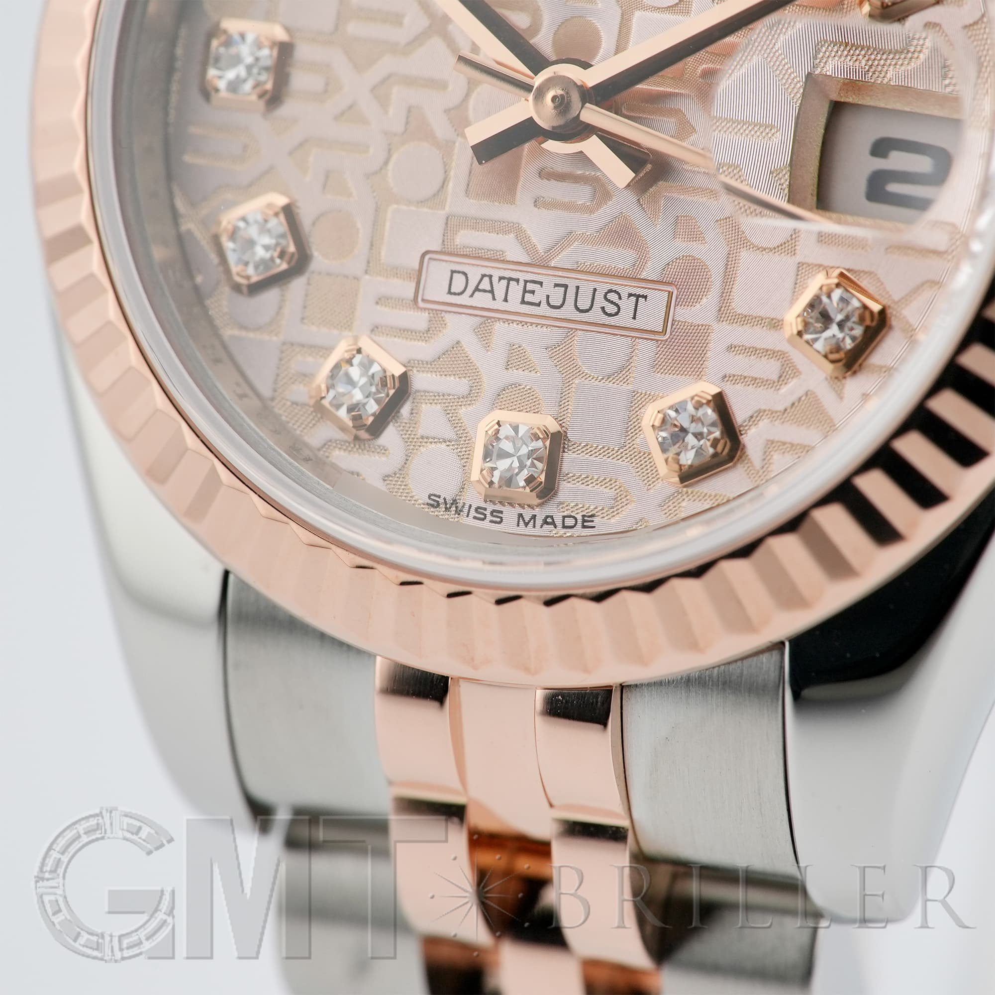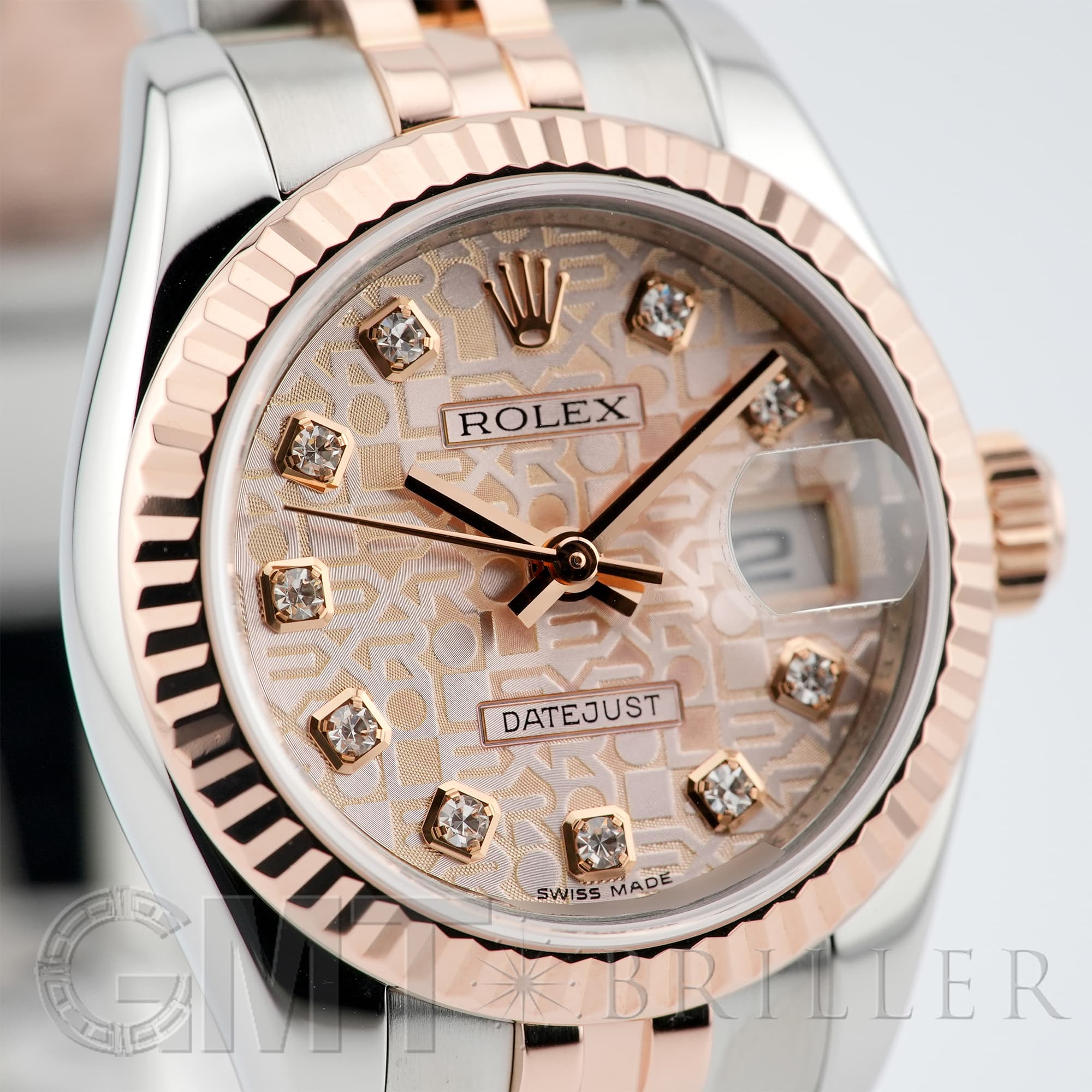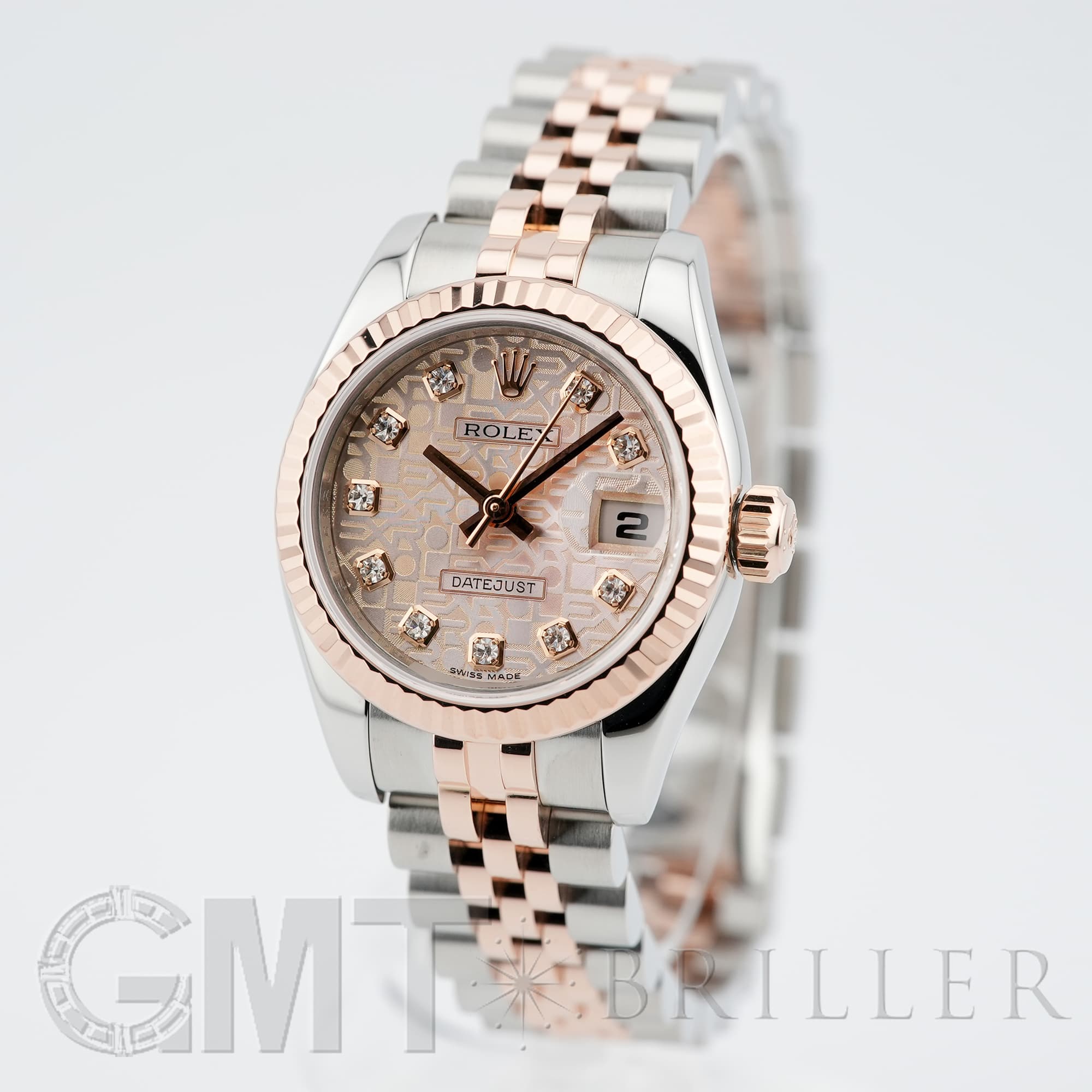 レディースの「デイトジャスト」コレクションに2005年から追加された、ステンレスとエバーローズゴールドのコンビモデル「179171」。「ROLEX」の文字を敷き詰めた「コンピューター」文字盤に、ダイヤモンドがセッティングされており、ラグジュアリーな雰囲気を演出する1本です。