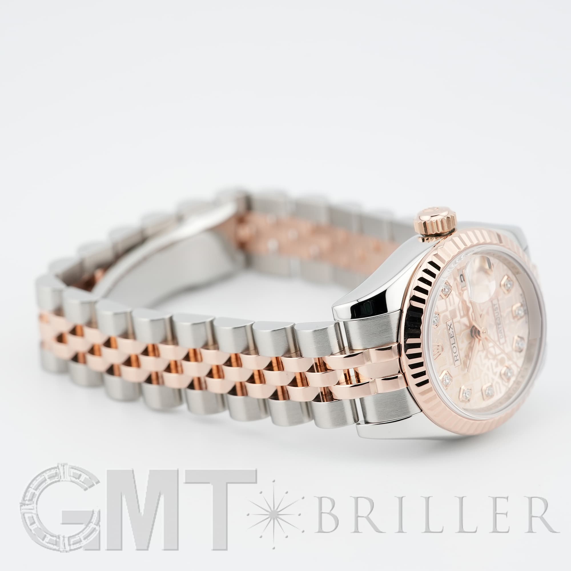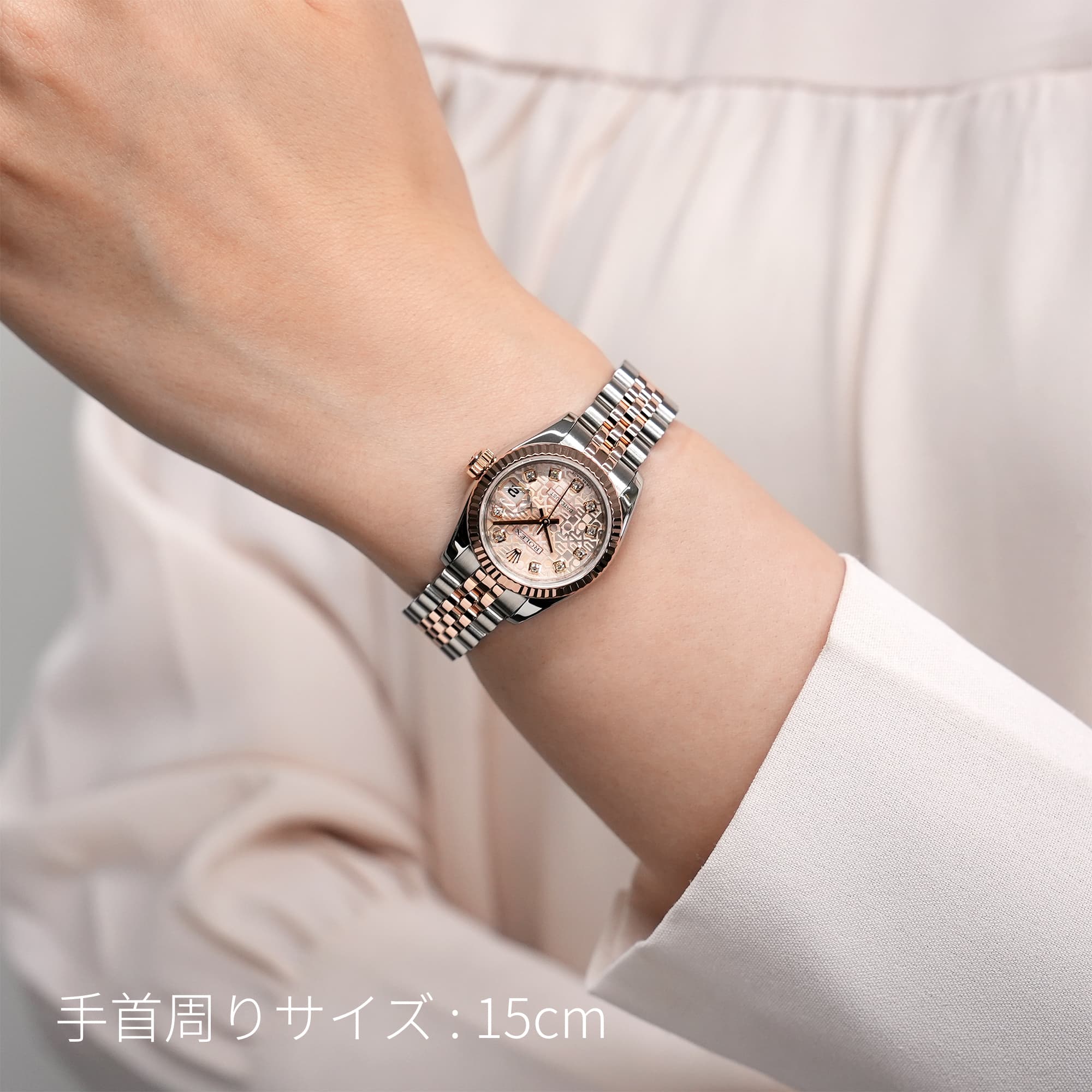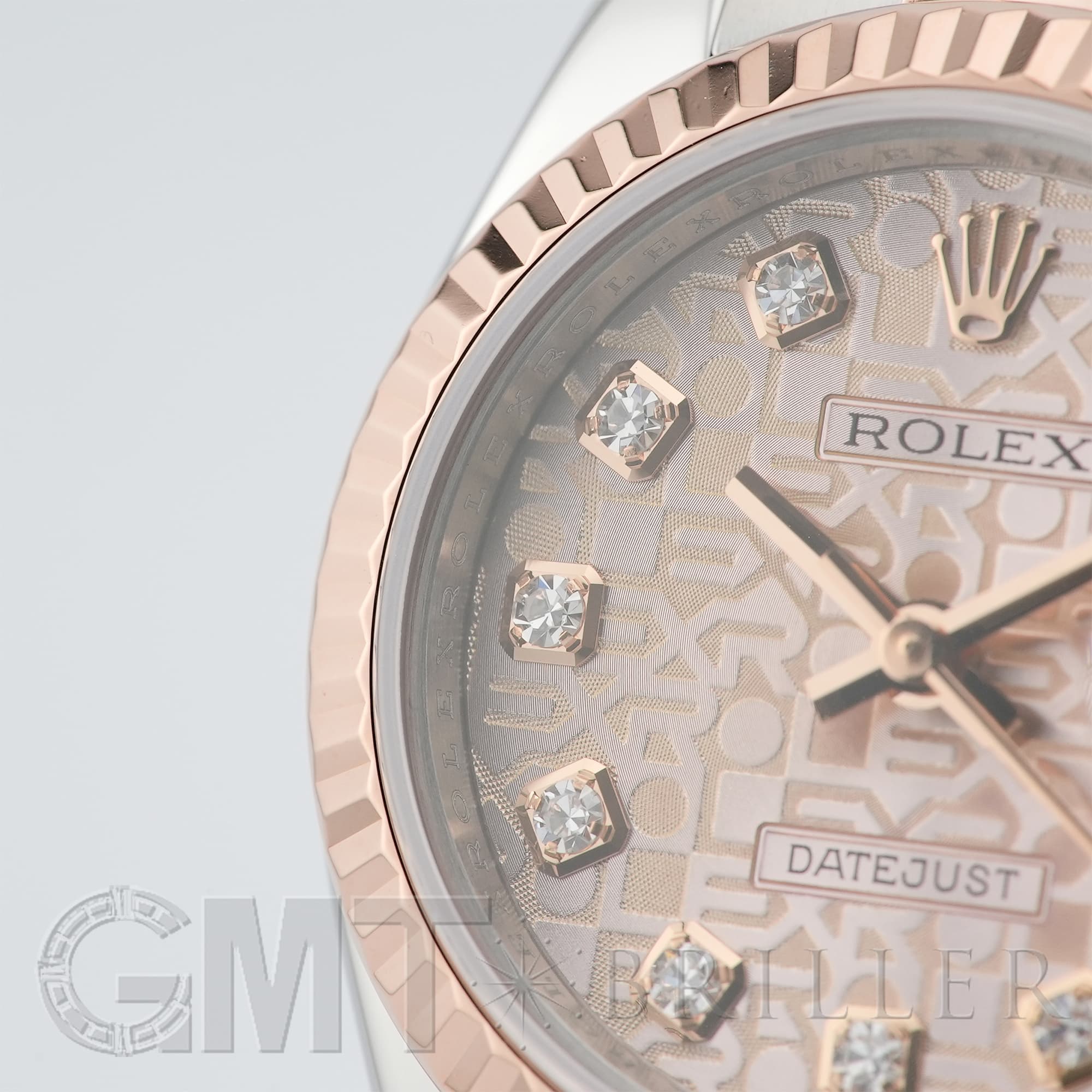 レディースの「デイトジャスト」コレクションに2005年から追加された、ステンレスとエバーローズゴールドのコンビモデル「179171」。「ROLEX」の文字を敷き詰めた「コンピューター」文字盤に、ダイヤモンドがセッティングされており、ラグジュアリーな雰囲気を演出する1本です。