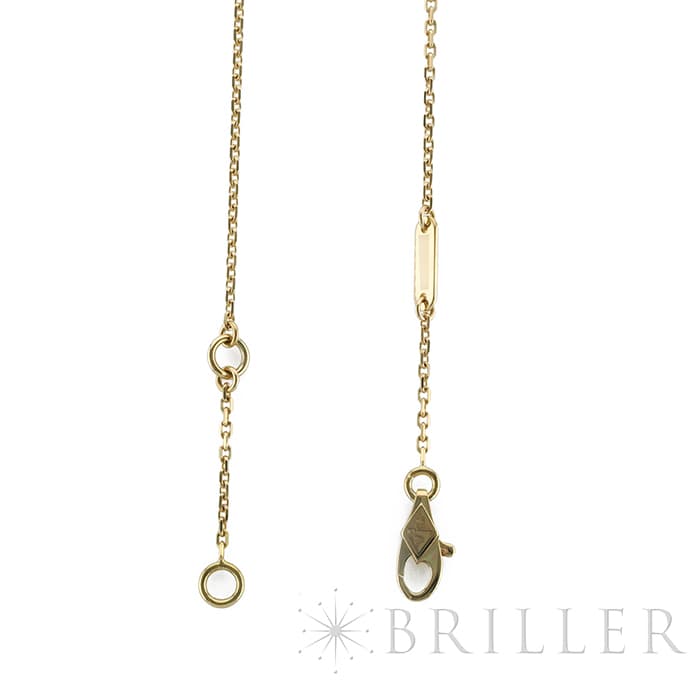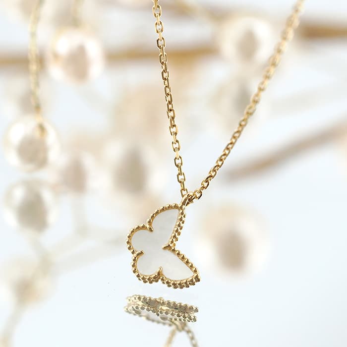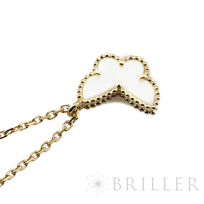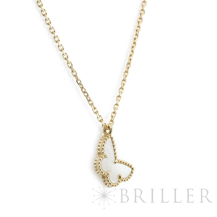 フランスに本店のある宝石、時計、香水を扱うハイジュエラー「ヴァンクリーフ&アーペル」。 1906年に誕生し、数多くのセレブリティから愛されているブランドとなります。 定番モデル「アルハンブラ」には複数のサイズ展開があり、こちらは「スウィート アルハンブラ」と呼ばれる一番小さいサイズになります。 さらに「パピヨン」と呼ばれる蝶をモチーフにしたデザインは小ぶりで可愛らしいモデルです。 アルハンブラを囲んでいるゴールドのビーズが大きく、厚みがあります。 イエローゴールド素材にマザー オブ パールが大変上品で美しいネックレスです。