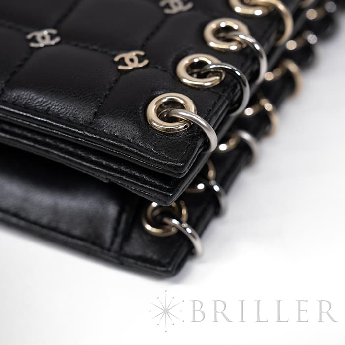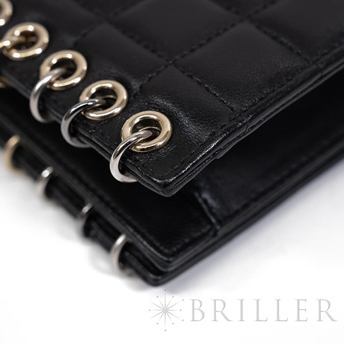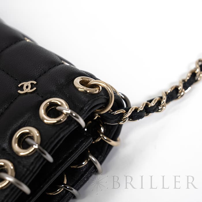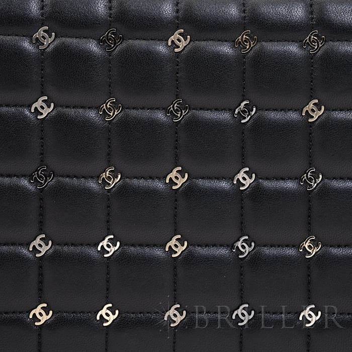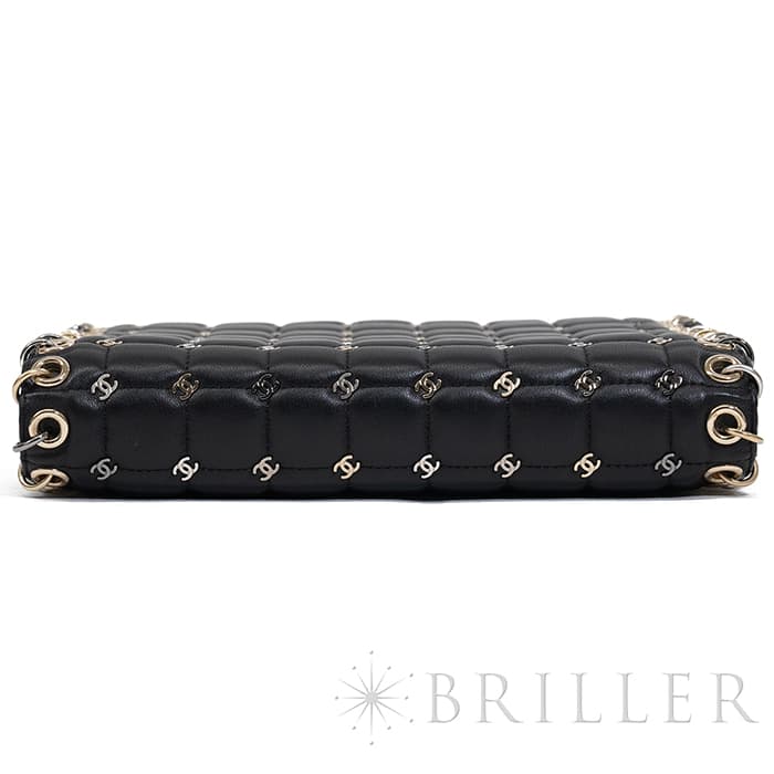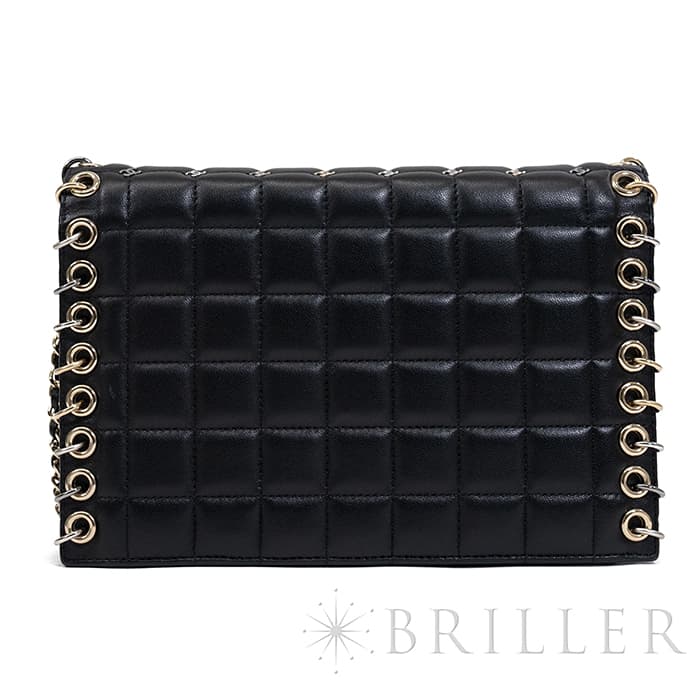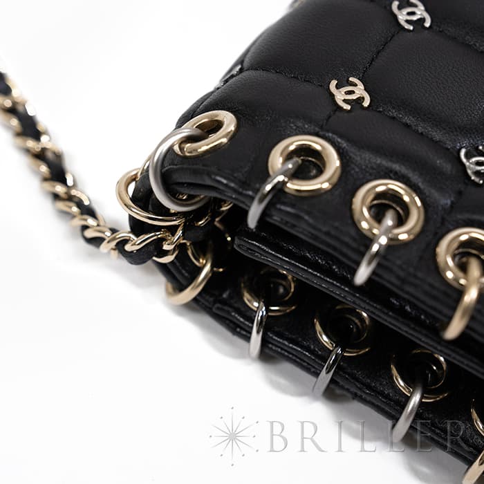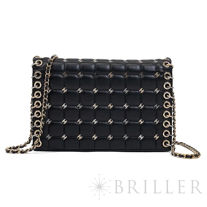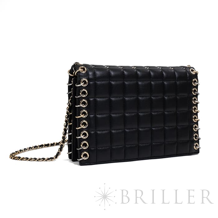 シャネル チョコバー チェーン バッグ ラムスキン ブラック ゴールド金具 CHANEL 名前の通りチョコレートバーを連想させる格子状のステッチが特徴的なショルダーバッグが入荷いたしました。ブラックのラムスキンにはルテニウム、シルバー、ゴールドカラーのCCスタッズが表面に、サイドには複数のピアスが付いたパンキッシュながら可愛らしいデザインでコーディネートのアクセントとして活躍してくれます。
