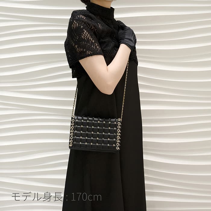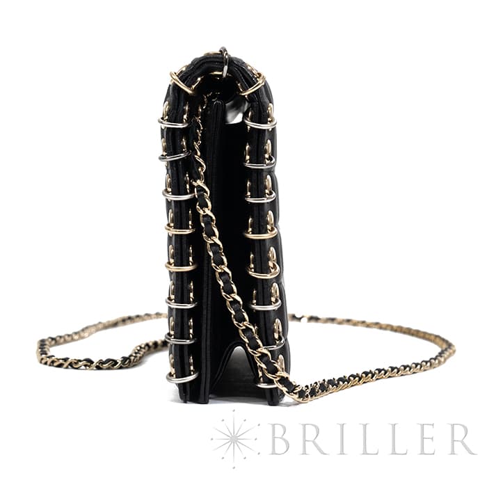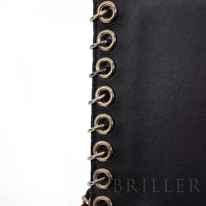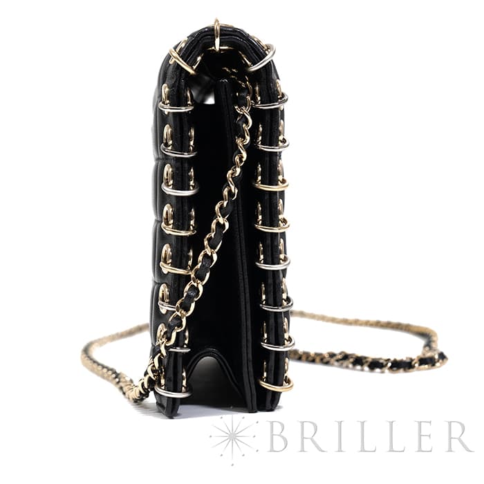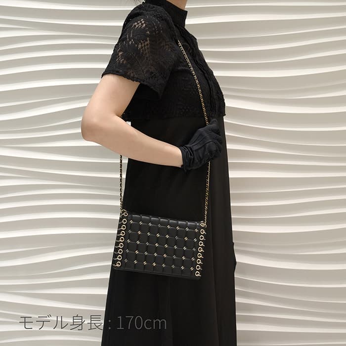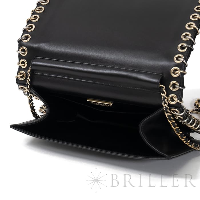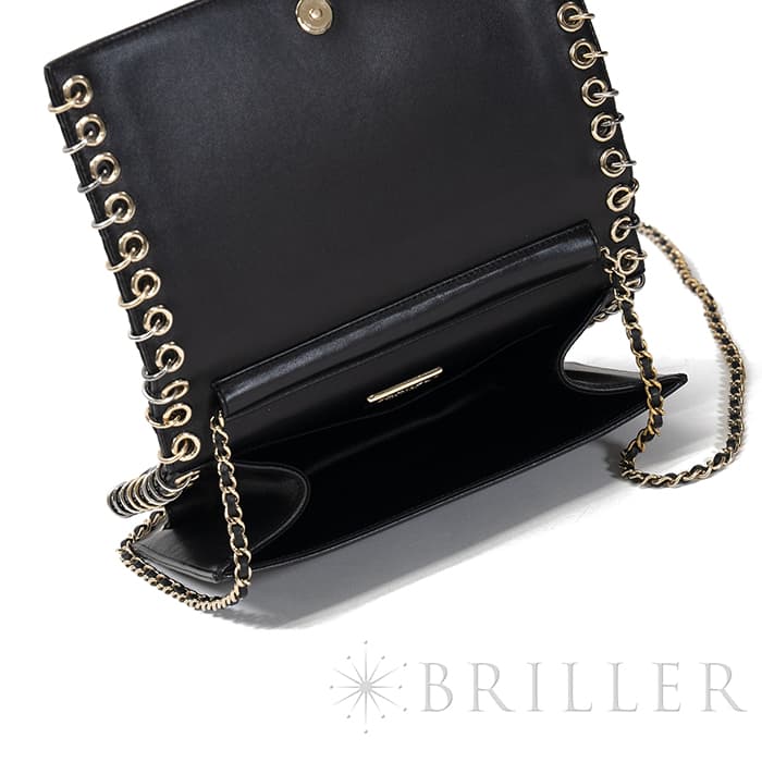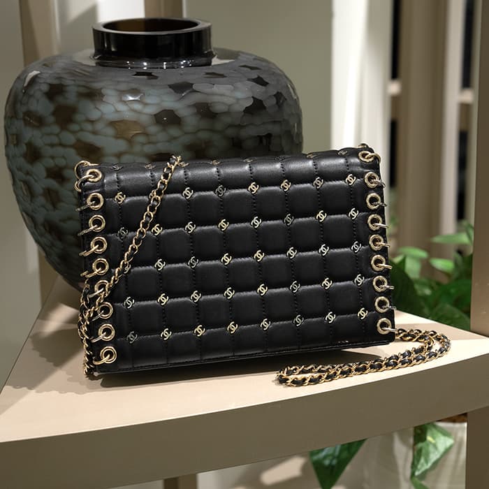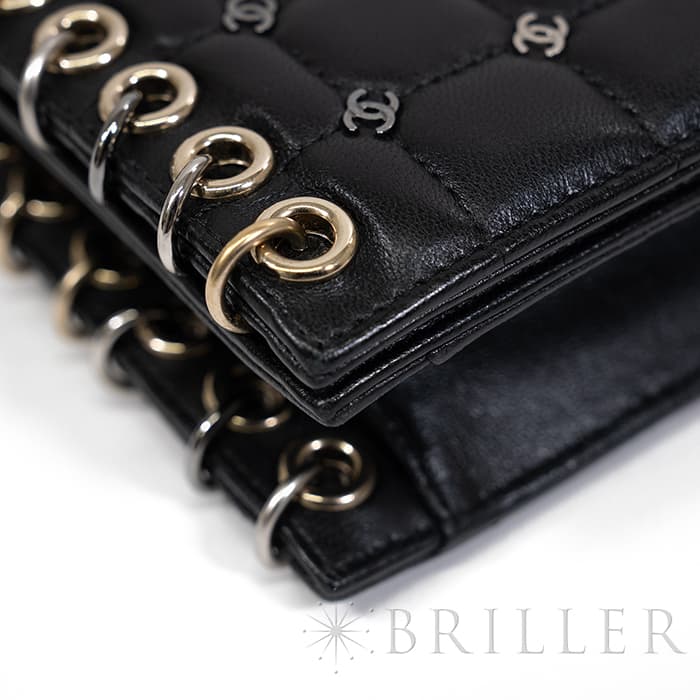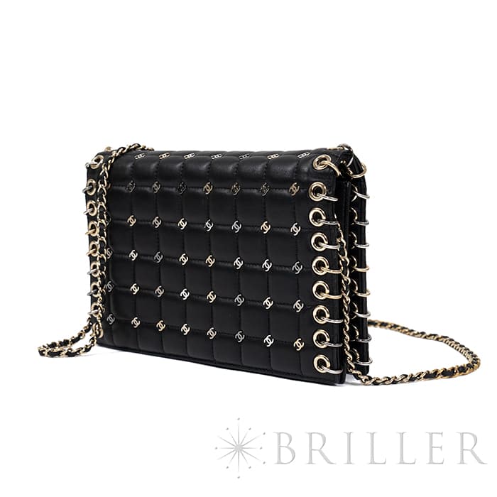 シャネル チョコバー チェーン バッグ ラムスキン ブラック ゴールド金具 CHANEL 名前の通りチョコレートバーを連想させる格子状のステッチが特徴的なショルダーバッグが入荷いたしました。ブラックのラムスキンにはルテニウム、シルバー、ゴールドカラーのCCスタッズが表面に、サイドには複数のピアスが付いたパンキッシュながら可愛らしいデザインでコーディネートのアクセントとして活躍してくれます。