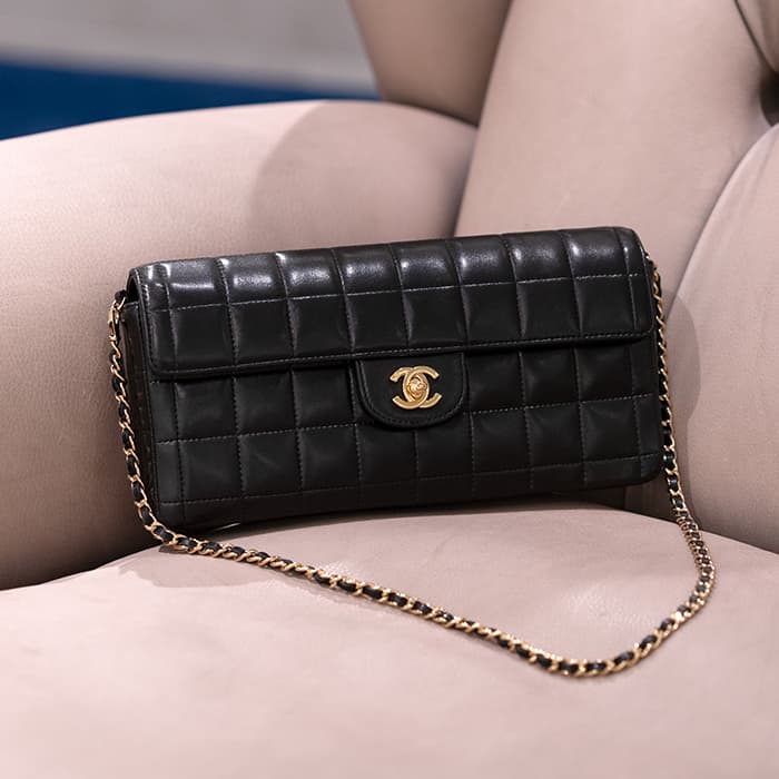 名前の通りチョコレートバーを連想させる可愛らしいショルダーチェーンが入荷いたしました。シャネルのアイコンであるココマークとスマートなチェーンをバッグ側面にもあしらったモダンなデザインが、コーディネートのアクセントとして活躍してくれます。定番のブラック×ゴールド金具の為、幅広いファッションに合わせやすいショルダーバッグです。