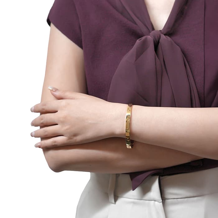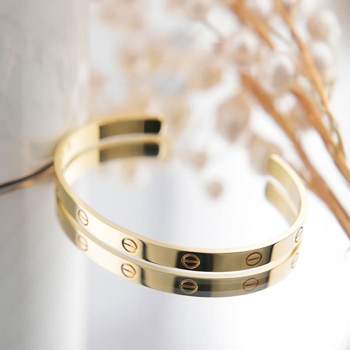 1969年にアルド・チプロによってデザインされ、1970年に誕生したラブブレスレット。ビスを付属のドライバーで留める斬新なデザインが話題になり、今では定番人気のジュエリーになっています。こちらはオープンバングルタイプで、シーンに合わせて身に着けることができる手軽さが魅力です。フォルム自体はシンプルなので、重ね付けにしてもおしゃれな手元になりそうです。