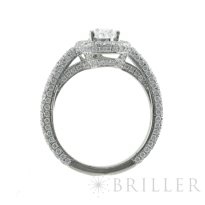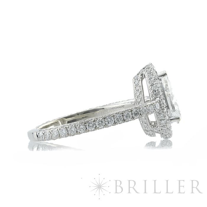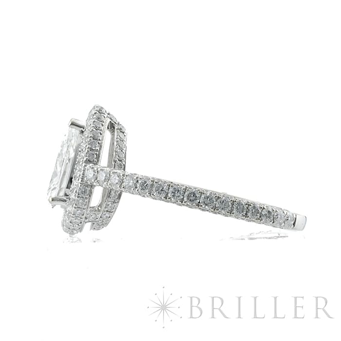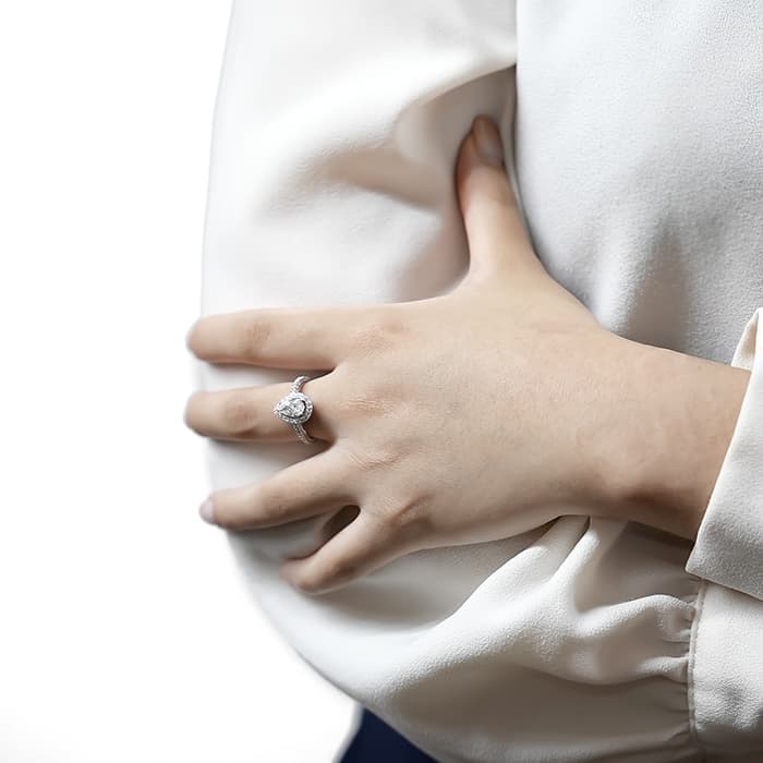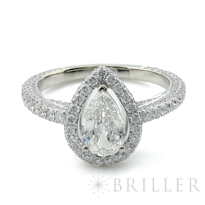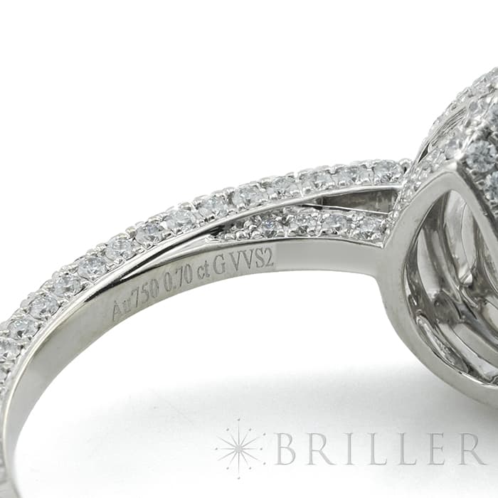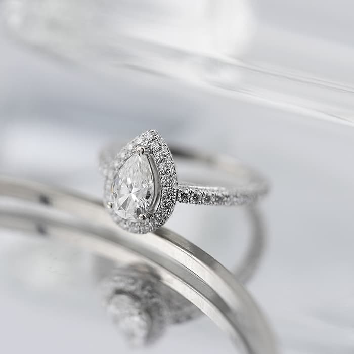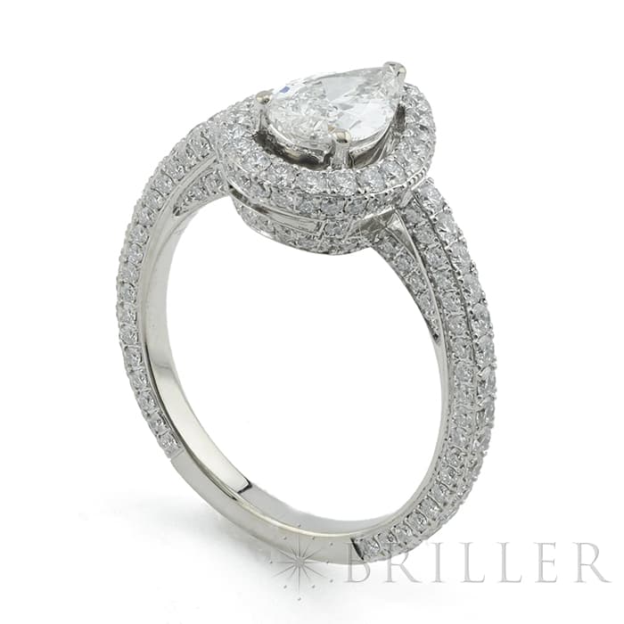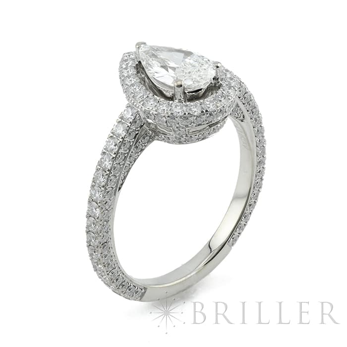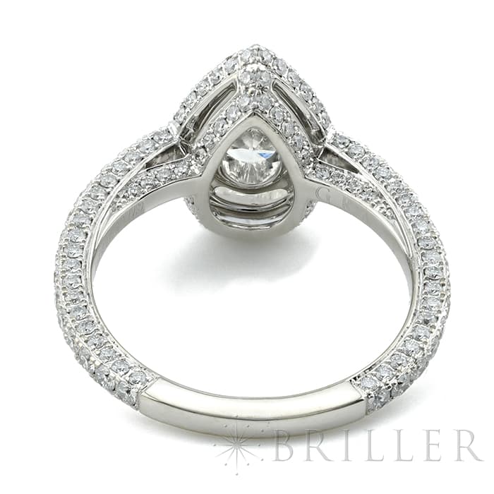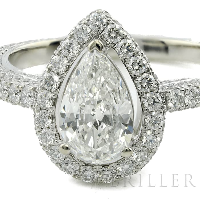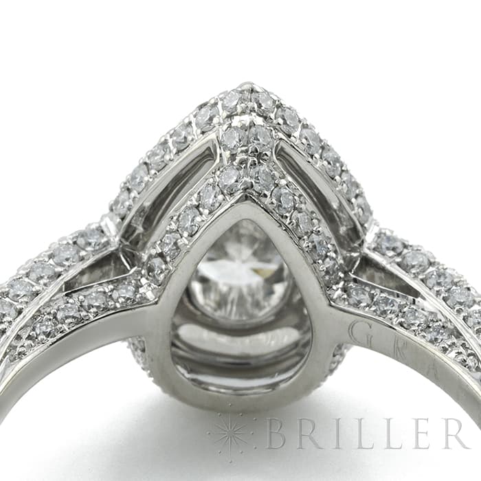 ペアシェイプダイヤモンドは0.70ctの大きさを誇り、カラーグレードG、クラリティVVS2という高品質なものが使用されています。 石座やアームにまで無数のパヴェダイヤモンドがセッティングされており、グラフのダイヤモンドを存分に堪能できるたいへんラグジュアリーなリングです。