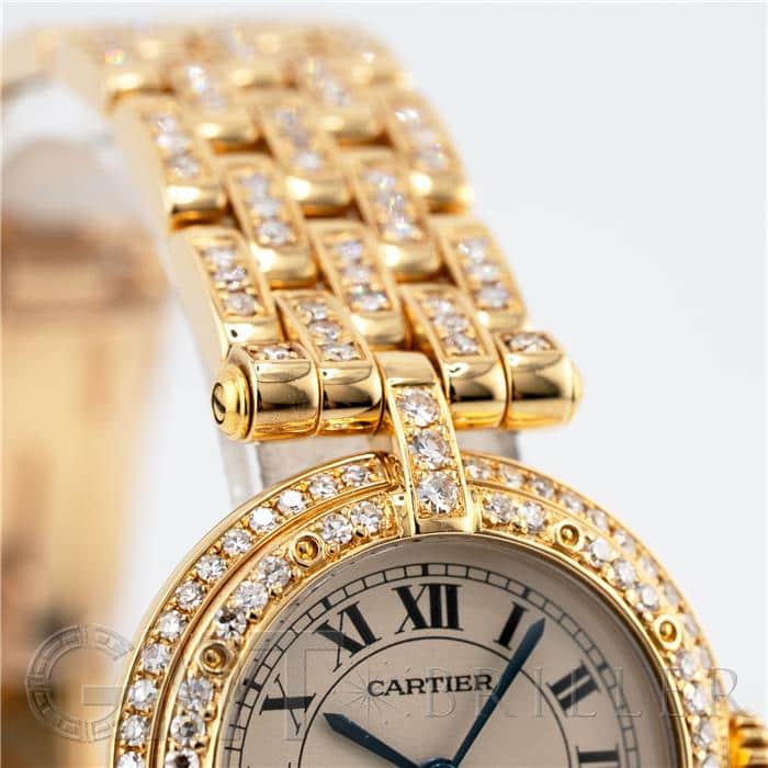カルティエ パンテール ヴァンドーム SM WF5032FF イエローゴールド 馬車の車輪からインスピレーションを得た「ヴァンドーム 」と、豹のしなやかな体を表現した「パンテール 」を組み合わせた「パンテール ヴァンドーム」。 小振りなサイズが女性らしさを引き立てる「WF5032FF」は、イエローゴールドを贅沢に使用したラグジュアリーな腕時計です。 時計本体のみならずブレスレットにまでパヴェダイヤが敷き詰められており、世界五大ジュエラーとして名を馳せるカルティエの高品質なダイヤモンドを存分にお楽しみいただけます。 保証書日付 ブランク(型番・シリアル・日付の記載されていない保証書が付属します) 2023年10月 カルティエにてコンプリートサービス・ライトポシッシュ済み 余りコマがないため、手首回りをお確かめのうえご購入ください。 裏蓋に小傷はあるものの、状態の良い商品のため外装仕上を行っておりません。 当社の中古品はインターネットでも安心してご購入頂けるよう、しっかりとした点検整備を行っております。 カルティエ 時計の買取り・下取りも行っておりますので、お気軽にご相談ください。