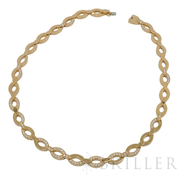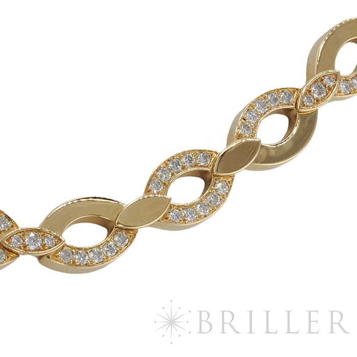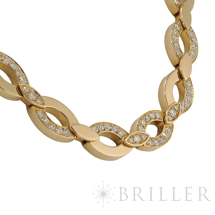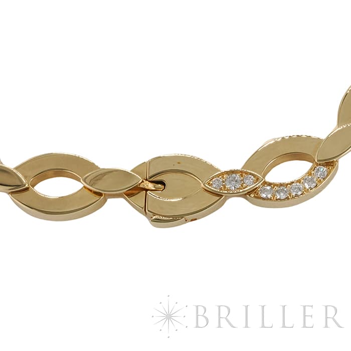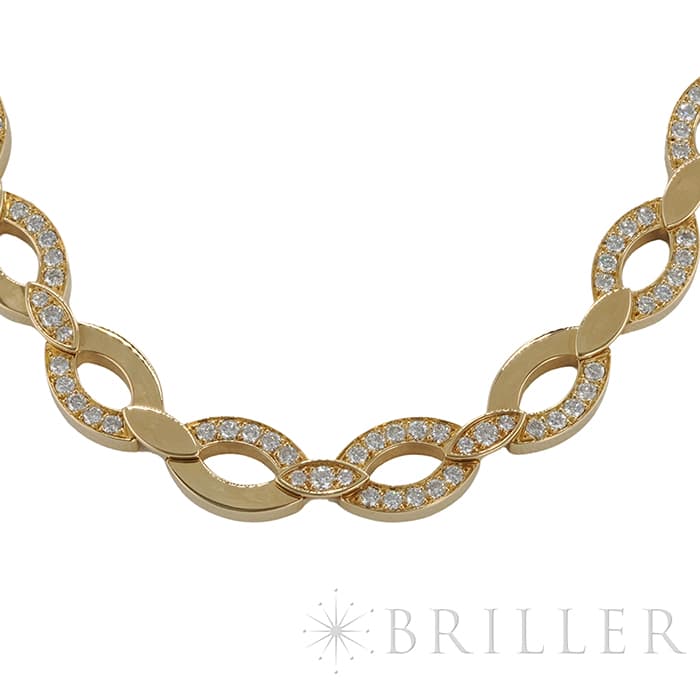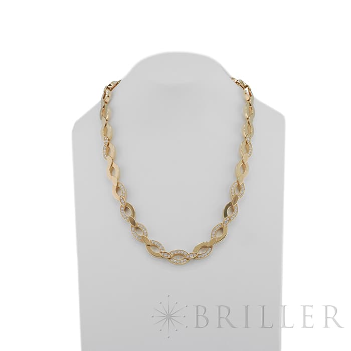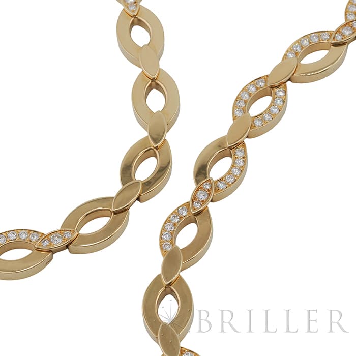 世界5大ジュエラーとして世界中から愛される「カルティエ」。フランスで誕生し、独創的なデザインや技術力の高さから圧倒的な支持を受けるブランドです。2つのマーキス型デザインが連なったデザインが特徴的なデザインのディアデアコレクション。イエローゴールドを使用したこちらのネックレスは、存在感抜群のジュエリーです。カルティエの高品質なダイヤモンドがいたるところにセッティングされており、たいへんラグジュアリーなネックレスに仕上がっています。