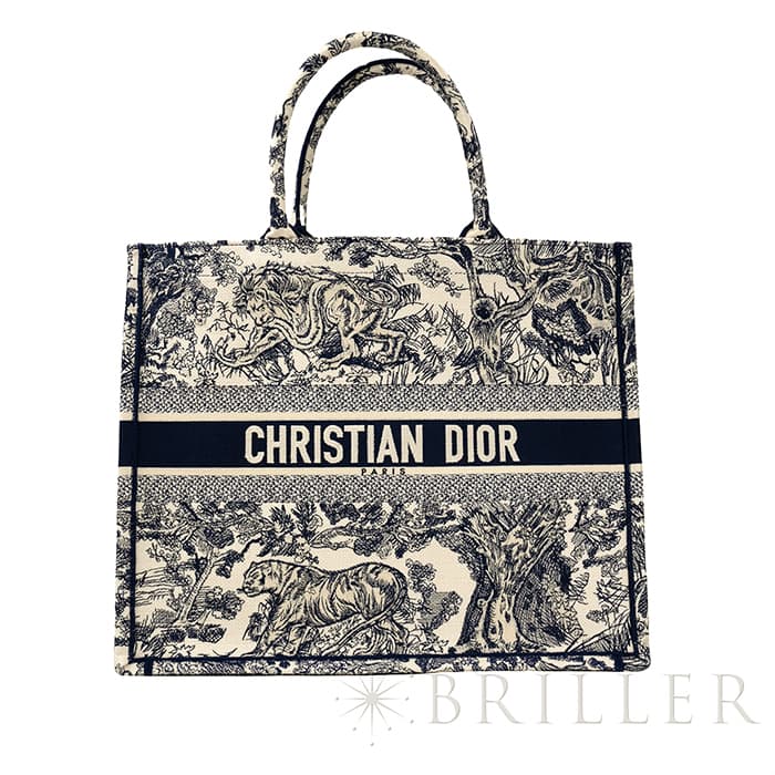 フランスのファッションデザイナー クリスチャン・ディオールが1946年パリで創立したファッションブランドを展開するクリスチャン・ディオール。ディオールのデザイナー、マリア・グラツィア・キウリが書店のトートバッグから着想を得て作成されたディオール新定番「ブックトート バッグ」。素材はエンブロイダリーキャンバスでブルーの「トワル ドゥ ジュイ」モチーフが全面に刺繍されており、中央にはChristian Dior Parisシグネチャーがデザインされています。ミニ、スモール、ミディアム、ラージの4つのサイズ展開がされており、ラージは一番大きいサイズで、手持ちのほか、肩掛けでもお使いいただけます。お財布やメイクポーチ、日傘をいれても余裕のあるたっぷりとしたサイズ感で、1泊2日のご旅行バッグとしても十分な収納力です。