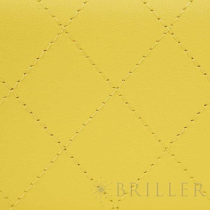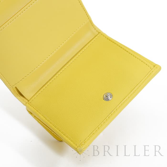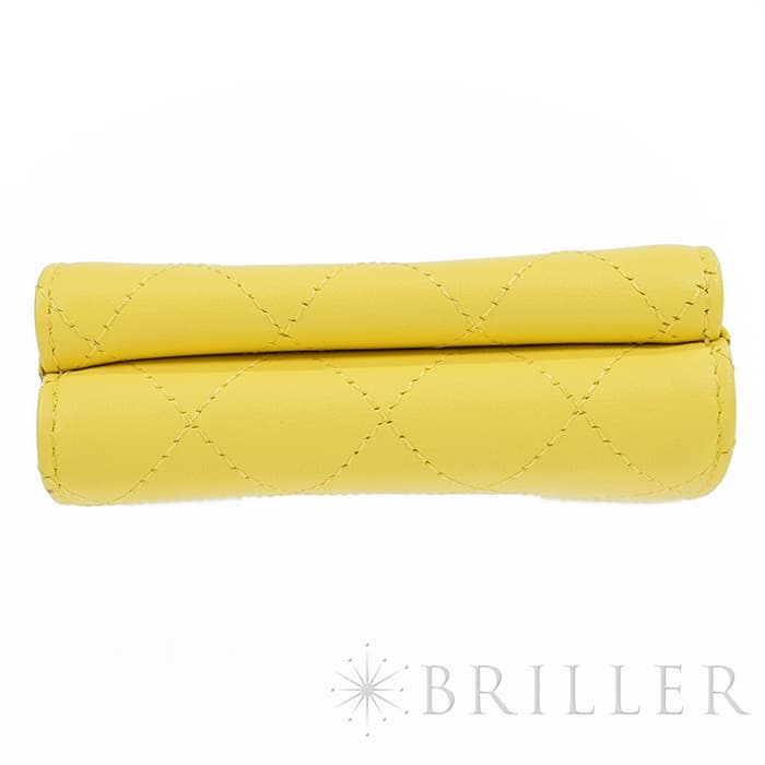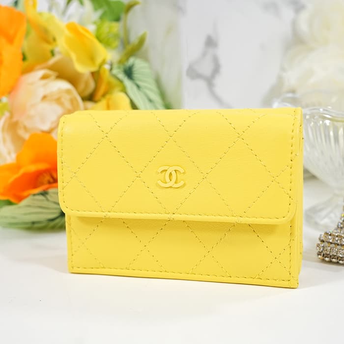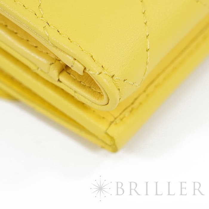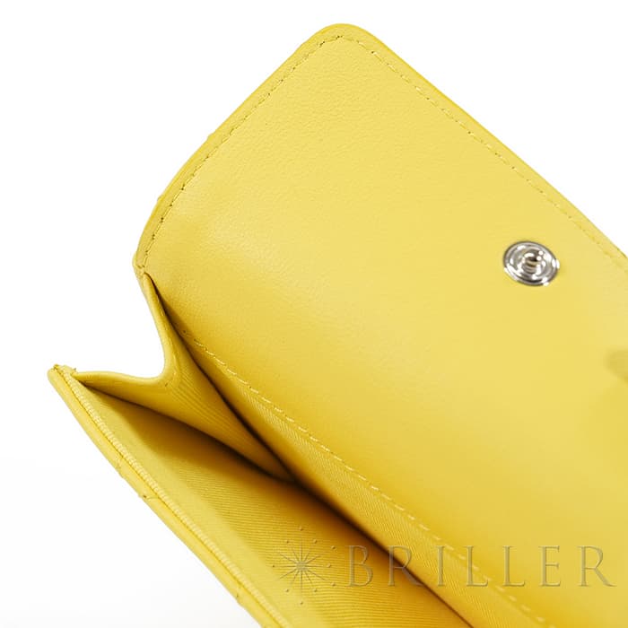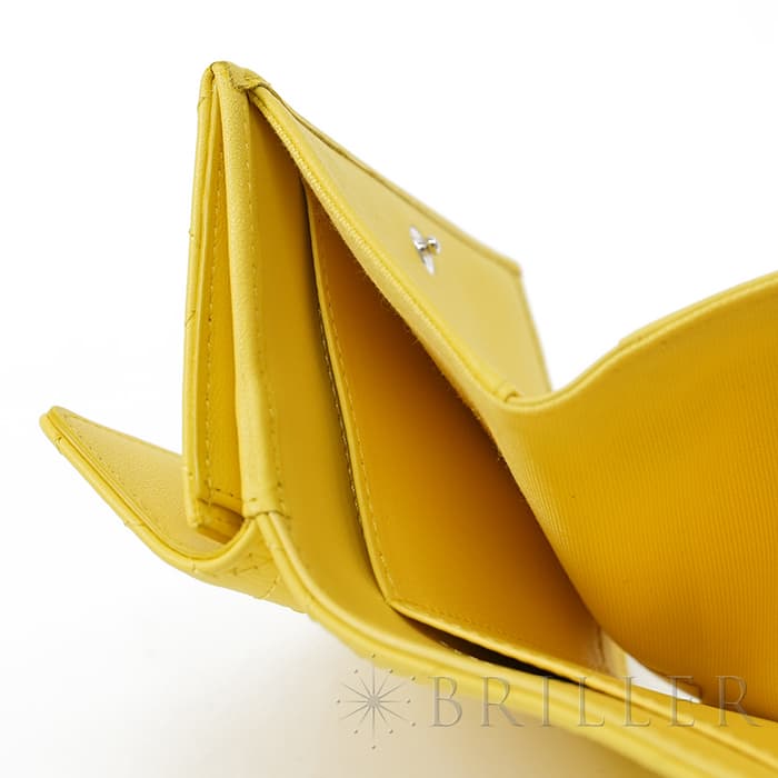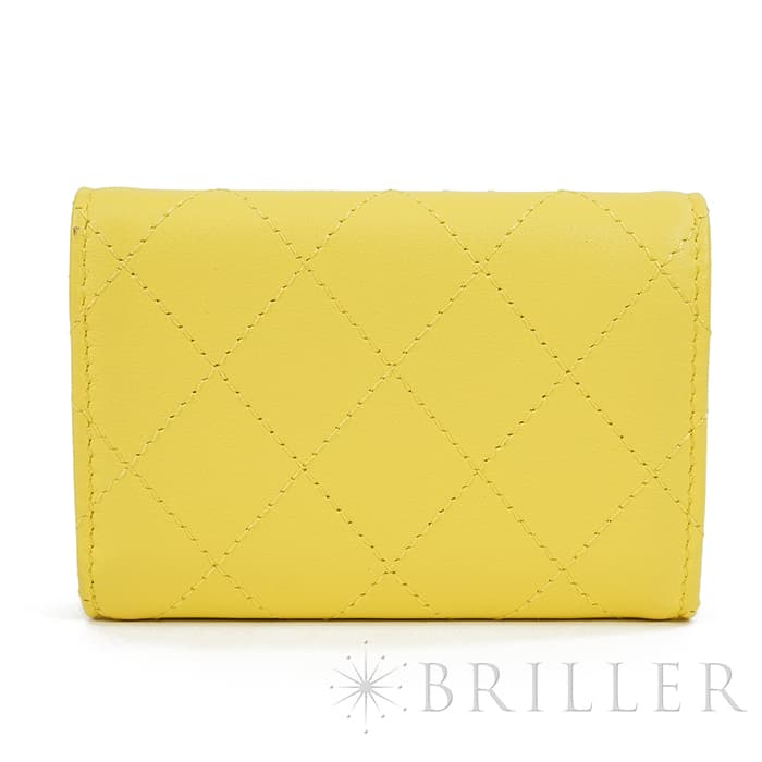 鮮やかなイエローのスモール フラップ ウォレット。シャネルらしいキルティングのデザインにイエローのココマークがポイントになった財布です。 人気のミニバッグに対応できるほどよいサイズ感ながら、三つ折りになっており、札入れ、カードポケット、小銭入れが付き、しっかり収納が出来ます。