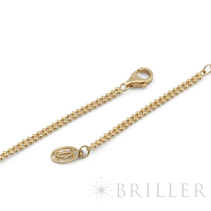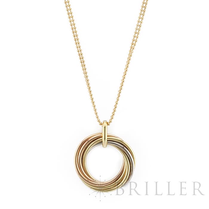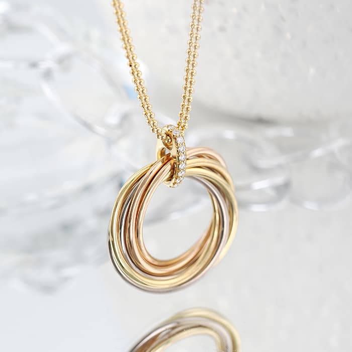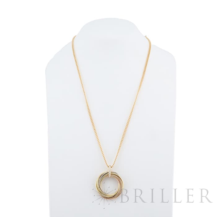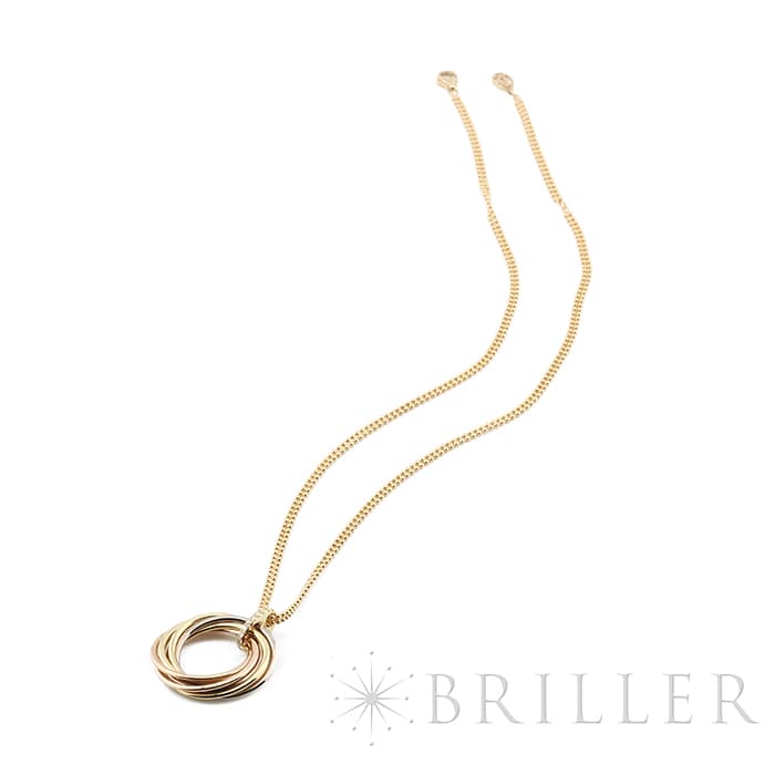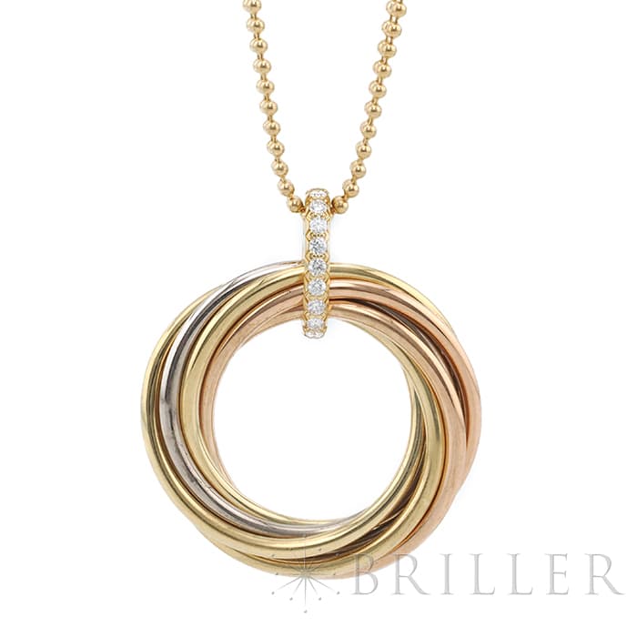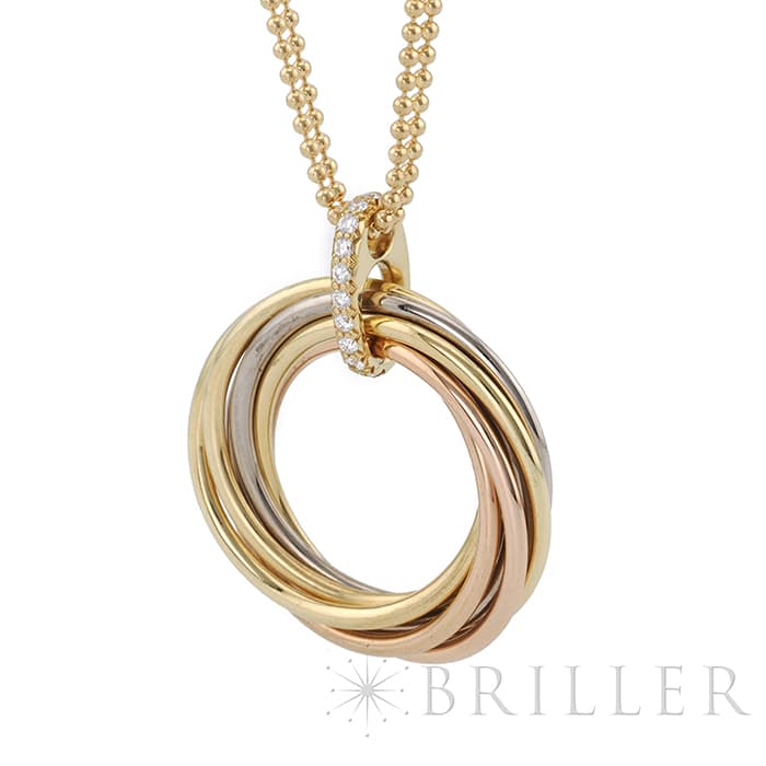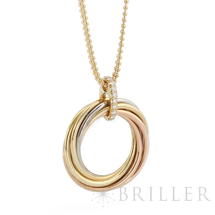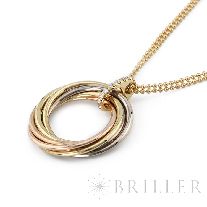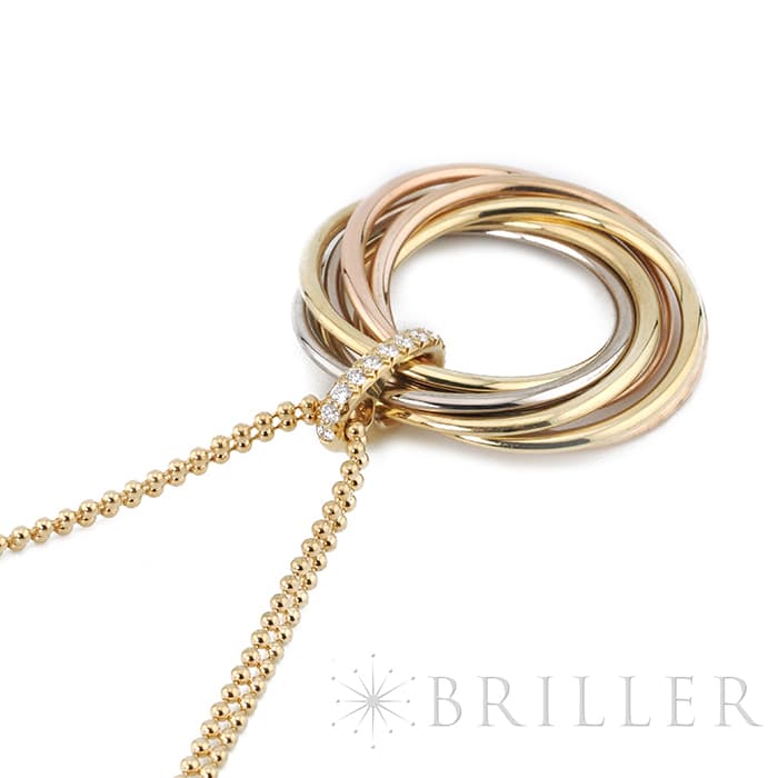 フランスで誕生し世界五大ジュエラーの一角である「カルティエ」。独創的なデザインや技術力の高さから圧倒的な支持を受けるブランドです。トリニティは英語で「3重、3つ組、3つ」を意味しその名の通り3つのゴールドが連なったデザインが特徴的。こちらのネックレスはホワイトゴールドが2つ、イエローゴールドが3つ、ピンクゴールドが2つのリングが連なり、まとめるつなぎ部分にダイヤモンドがセッティングされ上品な印象を与えます。