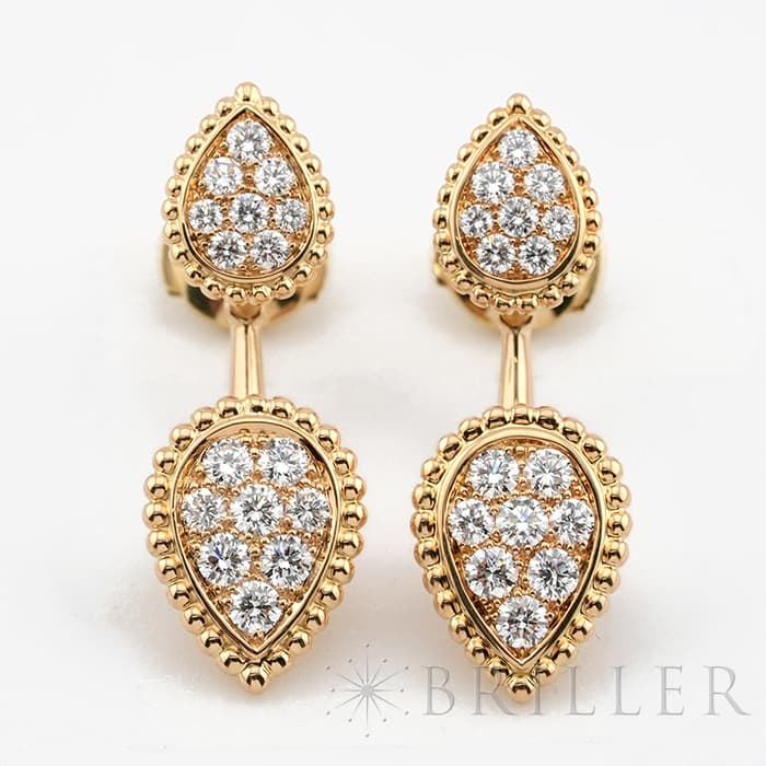 パリ5大宝飾ブランドである「ブシュロン」。時計や香水事業も展開し、ジュエラーらしい独創的なデザインや技術力の高さから多くのセレブリティに愛されています。蛇を意味する「セルパン」と自由を意味する「ボエム」の「セルパンボエム」はブシュロンを代表するシリーズの一つです。特徴的なスネークモチーフのデザインにイエローゴールド素材とダイヤモンドがセッティングされたピアスです。通常片耳のみの販売ですが、両耳セットになっております。