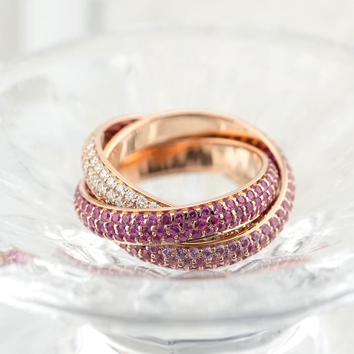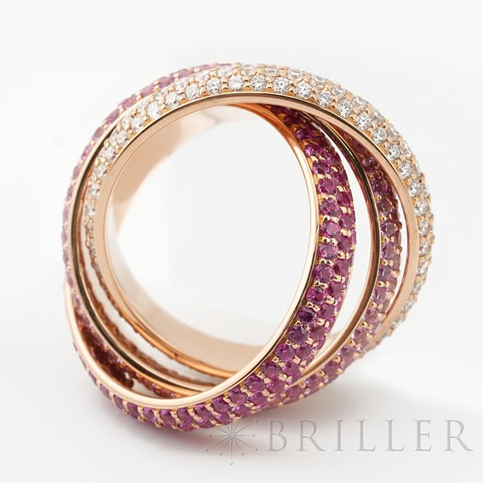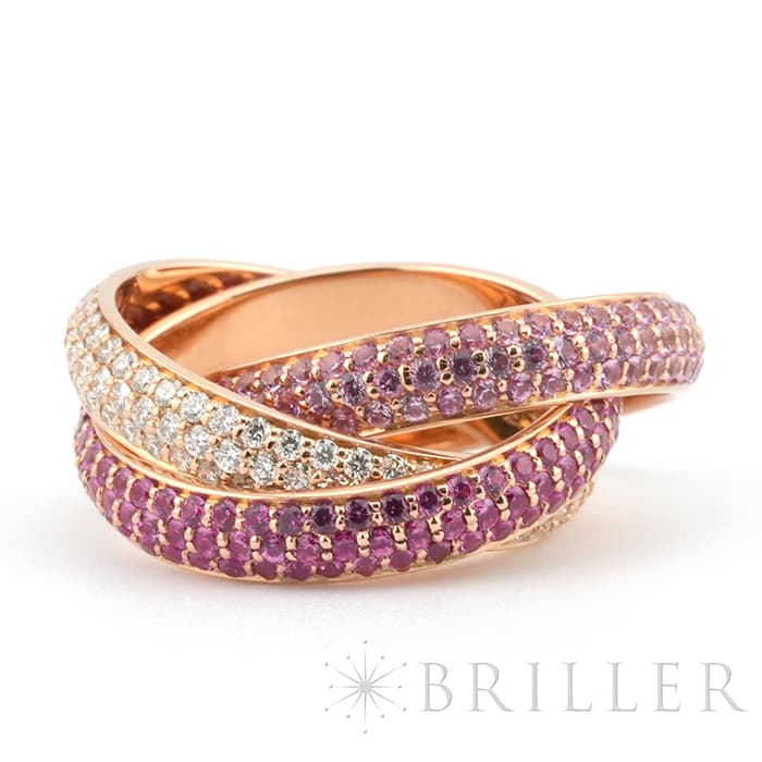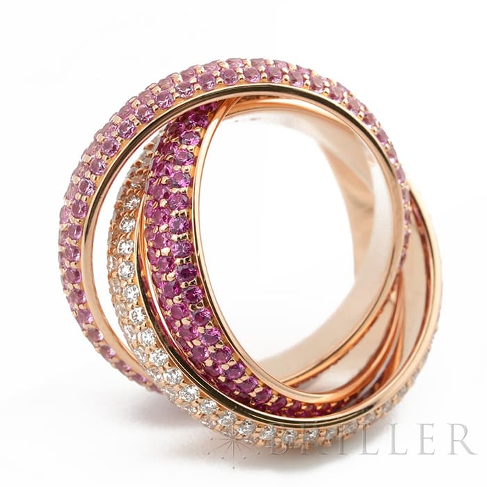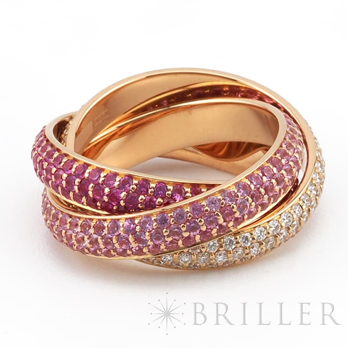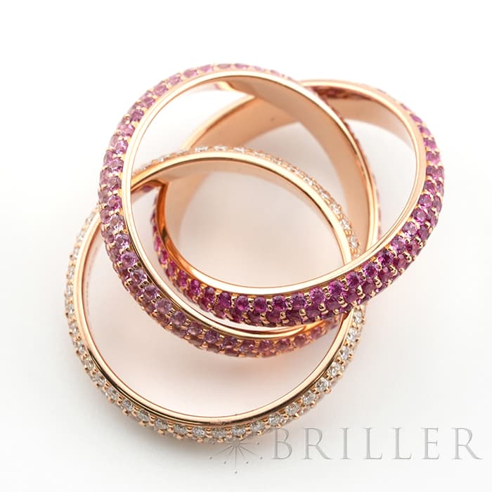フランスで誕生し世界五大ジュエラーの一角である「カルティエ」。独創的なデザインや技術力の高さから圧倒的な支持を受けるブランドです。トリニティは英語で「3重、3つ組、3つ」を意味しその名の通り3つのリングが連なったデザインが特徴的です。愛を象徴するピンクゴールドの3つのリングにはそれぞれダイヤモンドと色味の異なるピンクサファイア2 種がセッティングされており、華やかで可愛らしいリングです。