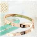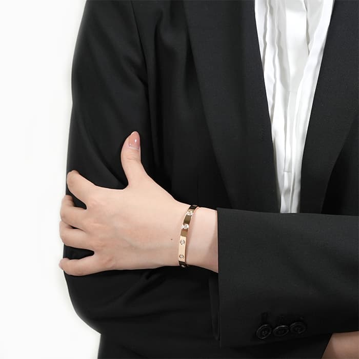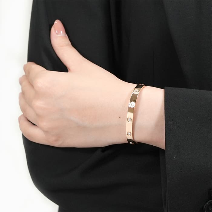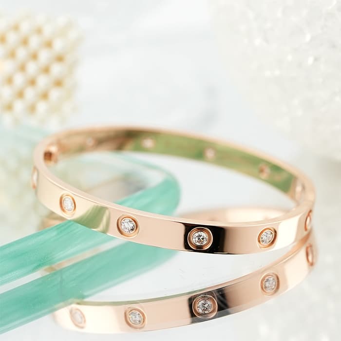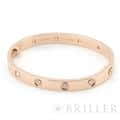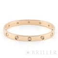 世界5大ジュエラーのひとつである「カルティエ」。1970年代にニューヨークで生まれたLOVE コレクションは、愛の絆を象徴するビスモチーフが特徴のコレクションです。こちらは肌なじみの良いピンクゴールド素材にビスの代わりとしてブリリアントカットの贅沢なダイヤモンドを配置、1本使いでも圧倒的な存在感を放つモデルとなっています。形状はバングル型でシンプルですので、ほかのジュエリーとの重ね付けにも違和感なくご使用いただけます。