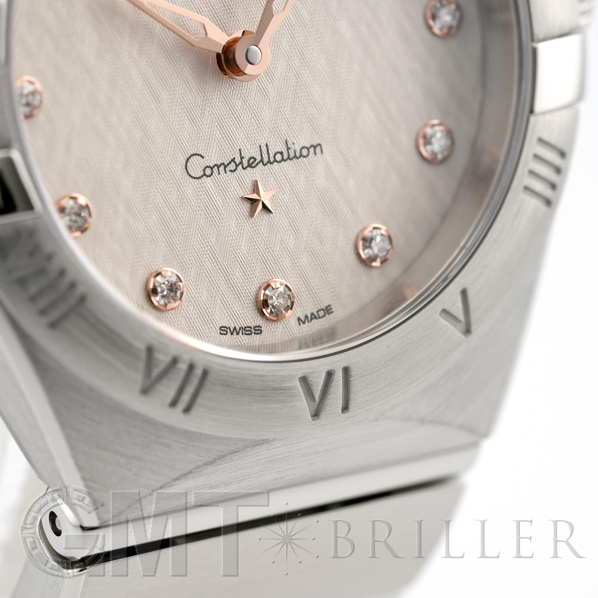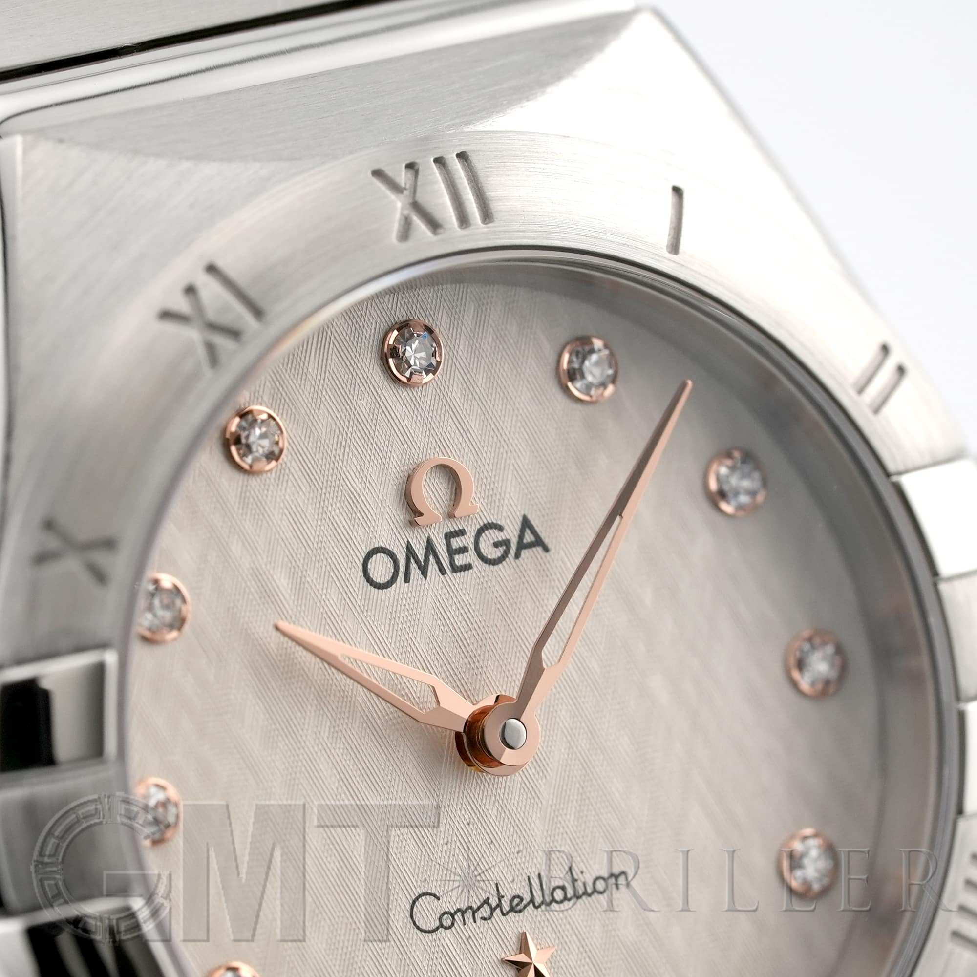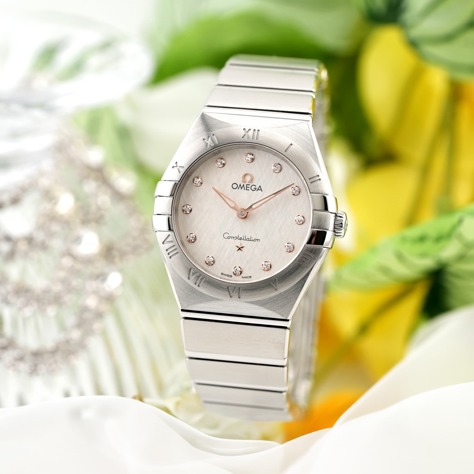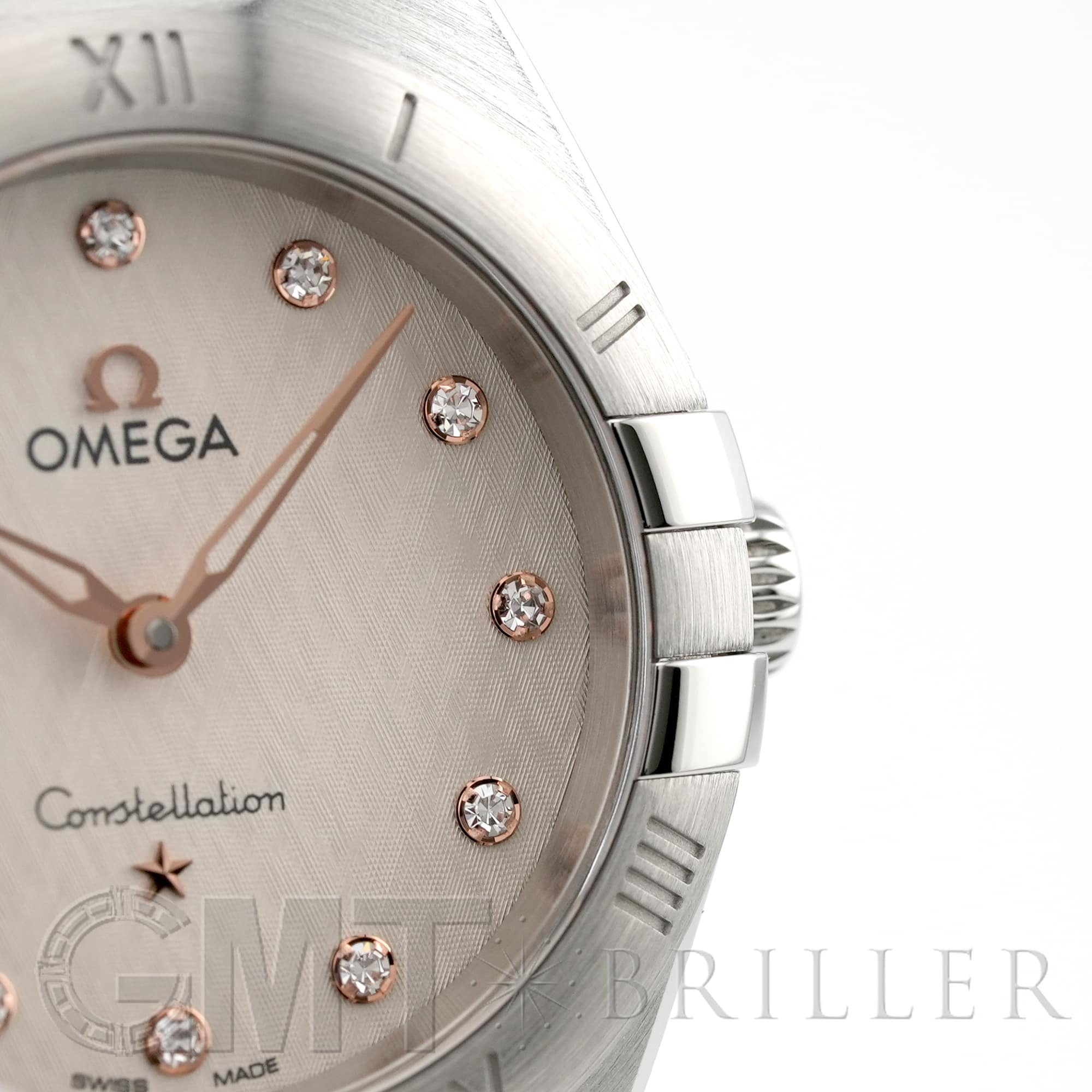 「コンステレーション」シリーズは1952年から女性たちに愛され続ける、オメガ不朽の名作です。 従来よりもスリムになった爪と、スレンダーになったベゼルに刻印されたローマ数字がこちらのモデルの特徴です。 クロス模様のパターンが施されたクリームシルバーダイアルは1960年代に制作されたコンステレーションのモデルからインスピレーションを得たもの。 クラシカルなコンステレーションに新たな魅力をもたらしています。 ダイヤモンドインデックスを縁取るのは針と同素材の18Kセドナゴールド。 視認性も確保され、美しさと機能美を兼ね備えた実用性の高い1本です