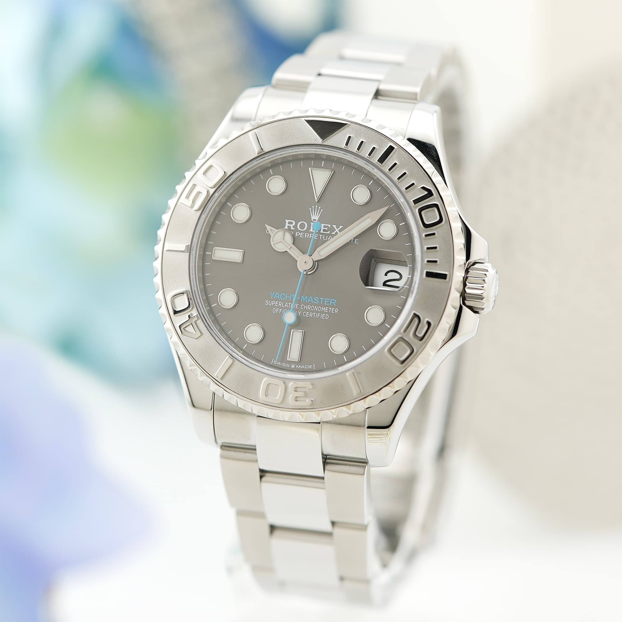ロレックス ヨットマスター37 268622 スレート 「168622」の後継モデルとして、2016年に誕生した「ヨットマスター 268622」。 35mmだったケースは37mmへと拡大され、スポーティーな腕時計が好みの女性から小振りなサイズを好む男性まで、性別を問わずご使用いただけるモデルとなっています。 プラチナ文字盤だった「168622」とは異なり、スレートグレーの文字盤が採用され、ライトブルーの秒針がアクセントとなる1本です。 保証書日付 2020年9月 (シリアル ランダム) 2025年2月 当社提携工房にて機械点検・調整・外装仕上済み 裏蓋に小傷がございます。 当社の中古品はインターネットでも安心してご購入頂けるよう、しっかりとした点検整備を行っております。 ロレックス 時計の買取り・下取りも行っておりますので、お気軽にご相談ください。
