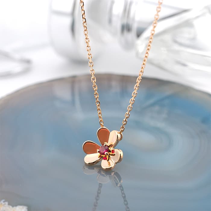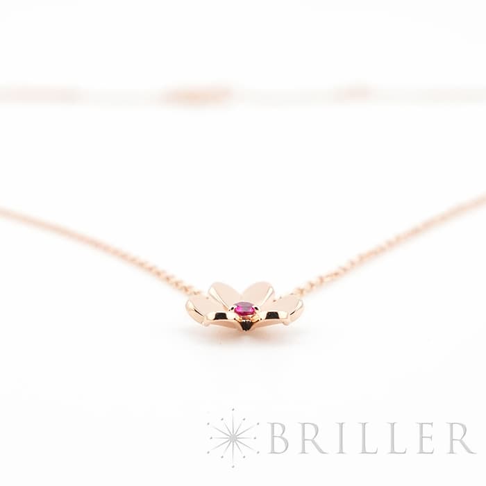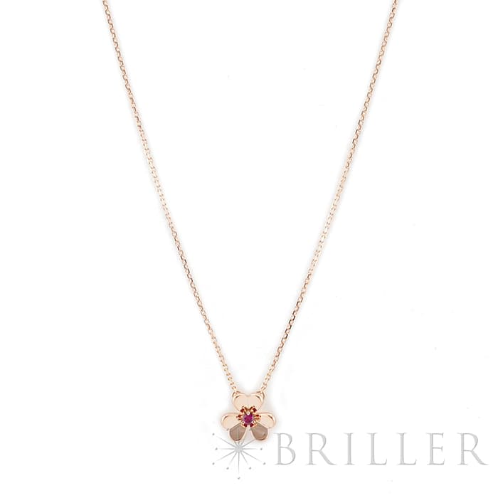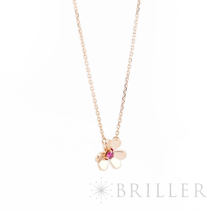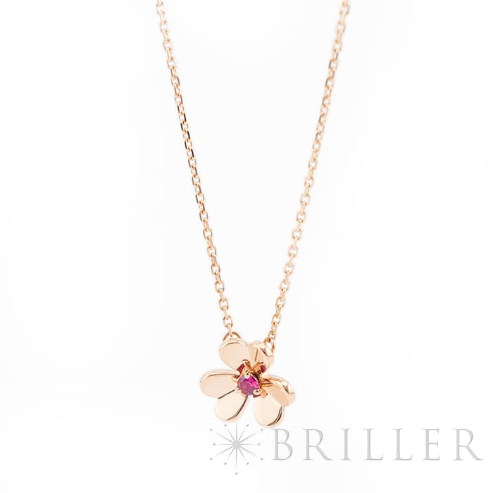 ヴァン クリーフ&アーペル フリヴォル ペンダント ネックレス ミニモデル ローズゴールド ルビー VCARP7S800 Van Cleef & Arpels フランスに本店のあるハイジュエラー「ヴァンクリーフ&アーペル」。1906年に誕生し、数多くのセレブリティから愛されているブランドです。代表モデルの一つ「フリヴォル」コレクション。今ではアルハンブラと並びヴァンクリーフ&アーペルの代表コレクションの一つとして高い人気を誇ります。そよ風にゆれる花々からインスピレーションを得ており、立体的な花のモチーフが愛らしいです。こちらはローズゴールドに中央にルビーをセッティング。華奢ながらも可愛らしいデザインです。