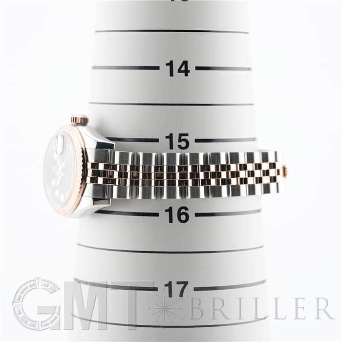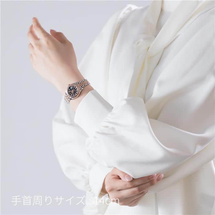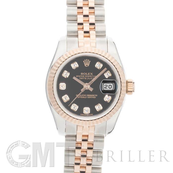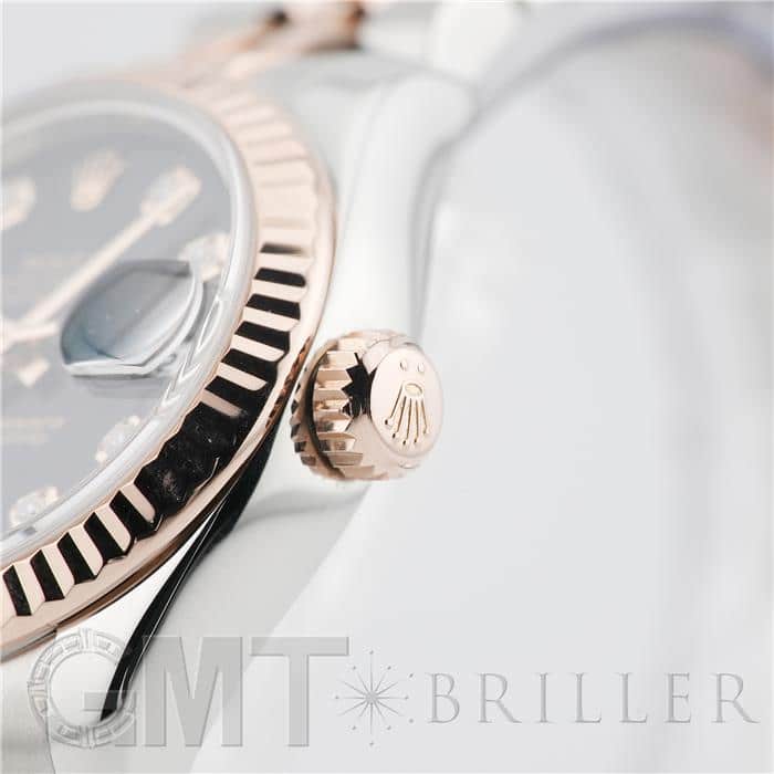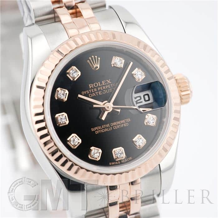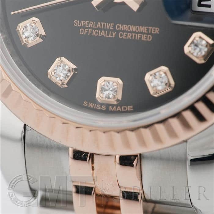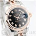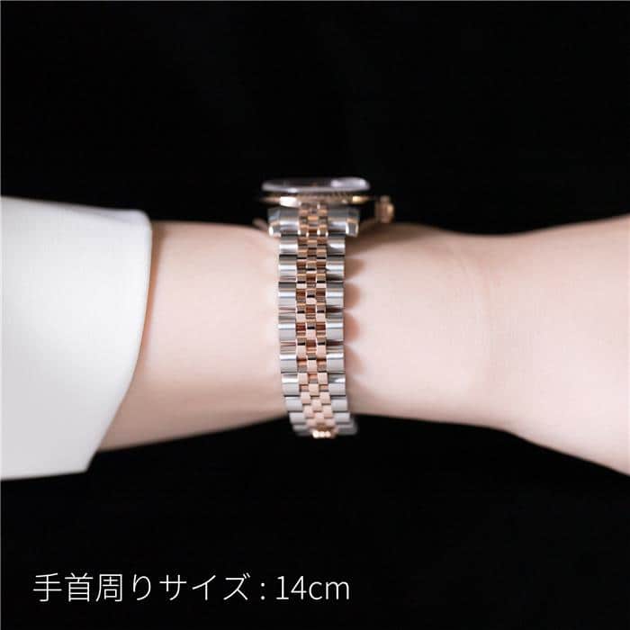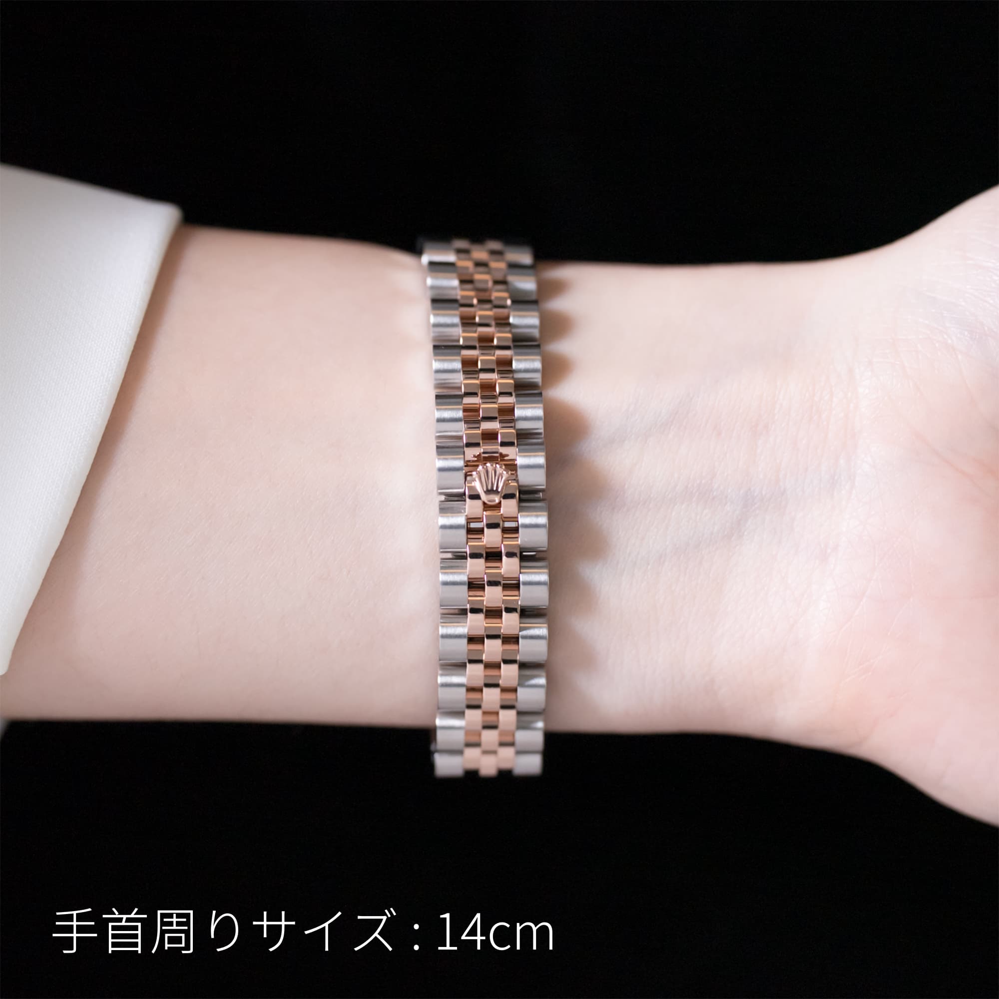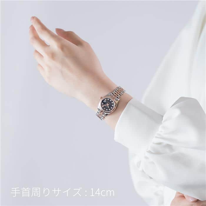ロレックス デイトジャスト26 179171G ブラック ロレックス「デイトジャスト26」Ref.179171Gは、すでに生産が終了した希少な26mmケースを採用した、極めて上品なレディースモデルです。 小ぶりなケースサイズは、女性の手元にさりげない華やかさと可憐な印象を与え、まるでジュエリーのような存在感を放ちます。 ケースおよびブレスレットは、エバーローズゴールドとステンレススチール(ロレックス独自のオイスタースチール)によるコンビ仕様。 文字盤には、シックで洗練されたブラックダイアルを採用し、どのような装いにも馴染む汎用性の高さが魅力です。10ポイントにあしらわれたダイヤモンドインデックスが、さりげなくも確かな輝きで手元を彩ります。 ベゼルには高級感あふれるフルーテッドベゼルを採用し、光の角度によって美しい陰影を生み出します。 ロレックスならではの伝統と革新が融合した、まさに資産価値をも兼ね備えた逸品。永く愛用いただける、ラグジュアリーかつ実用性を備えた傑作です。 シリアル ランダム(保証書日付 2015年7月) 2025年5月 当社提携工房にてオーバーホール・外装仕上済み ベゼルにキズが見られ、また裏ブタに打痕が見られます。 当社の中古品はインターネットでも安心してご購入頂けるよう、しっかりとした点検整備を行っております。 ロレックス 時計の買取り・下取りも行っておりますので、お気軽にご相談ください。