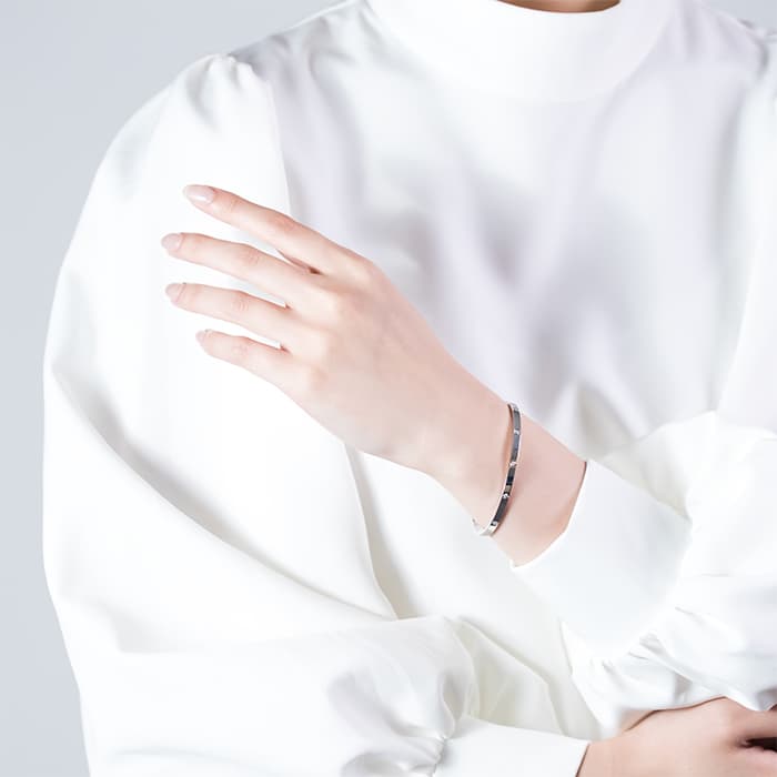 メジャーを手首に巻きつけて、手首のサイズを測ります。 サイズを確認して、ピッタリのサイズをお知らせください。お知らせいただいたサイズを元に、「標準的な余裕」がでるようにブレスレットサイズを調整いたします。 写真の場合、手首周りは「14cm」となります。